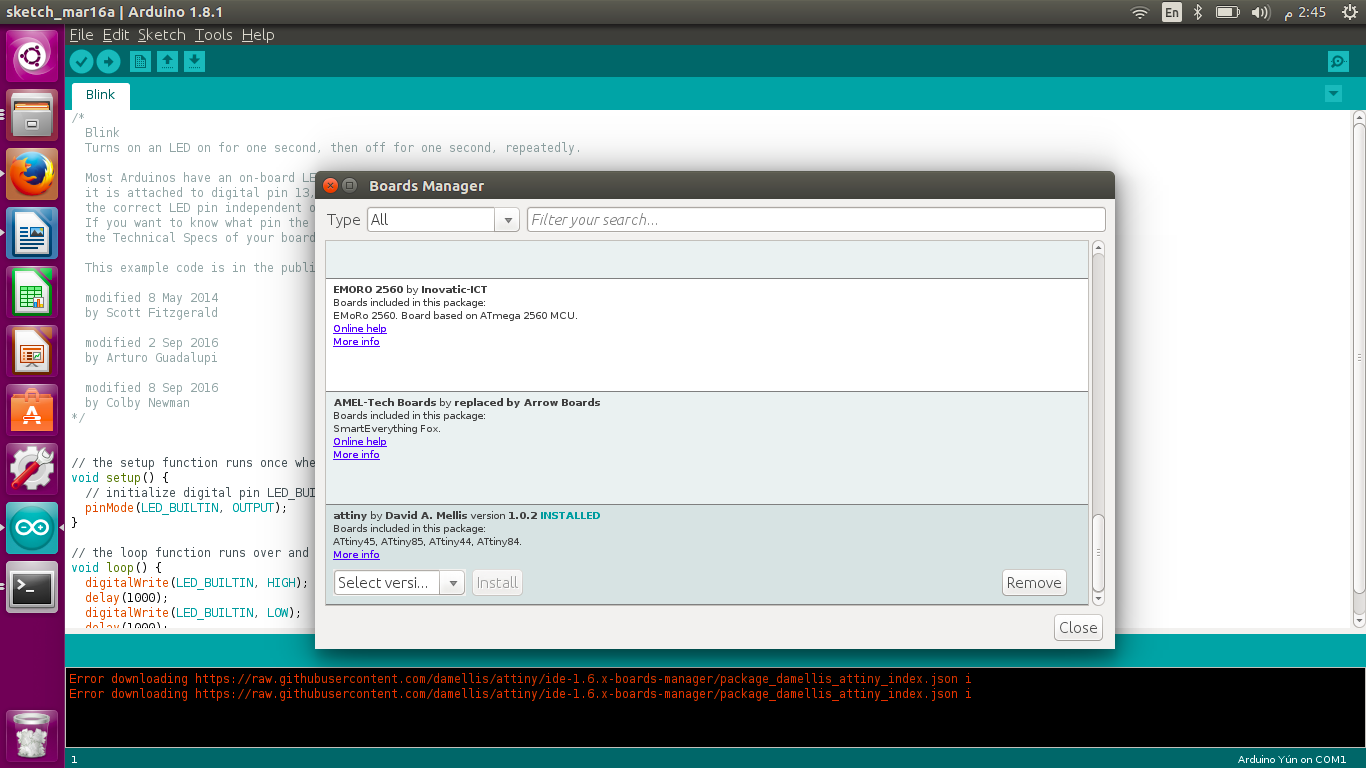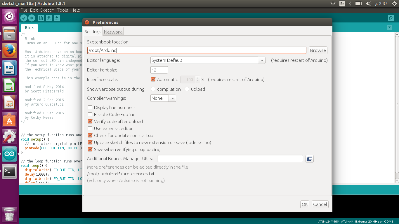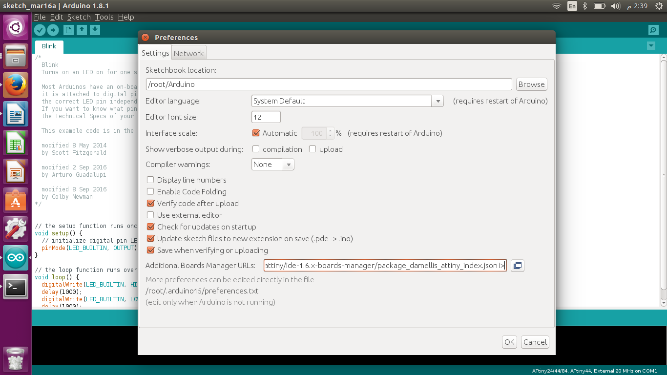 Then I pasted the url for the attiny library in the Additional Boards Manager URL’s text bar.