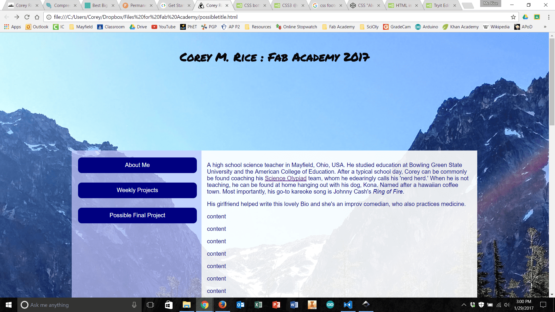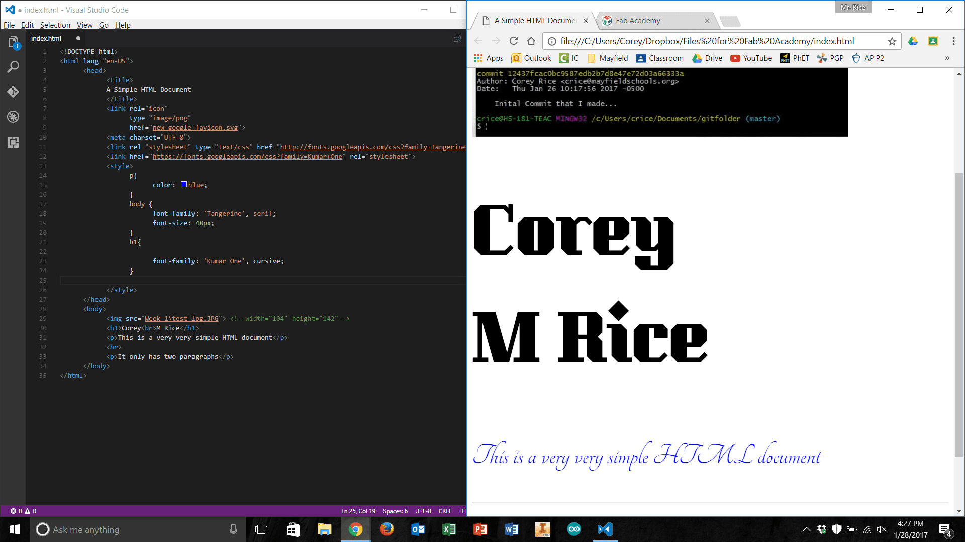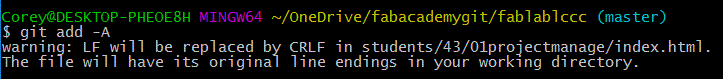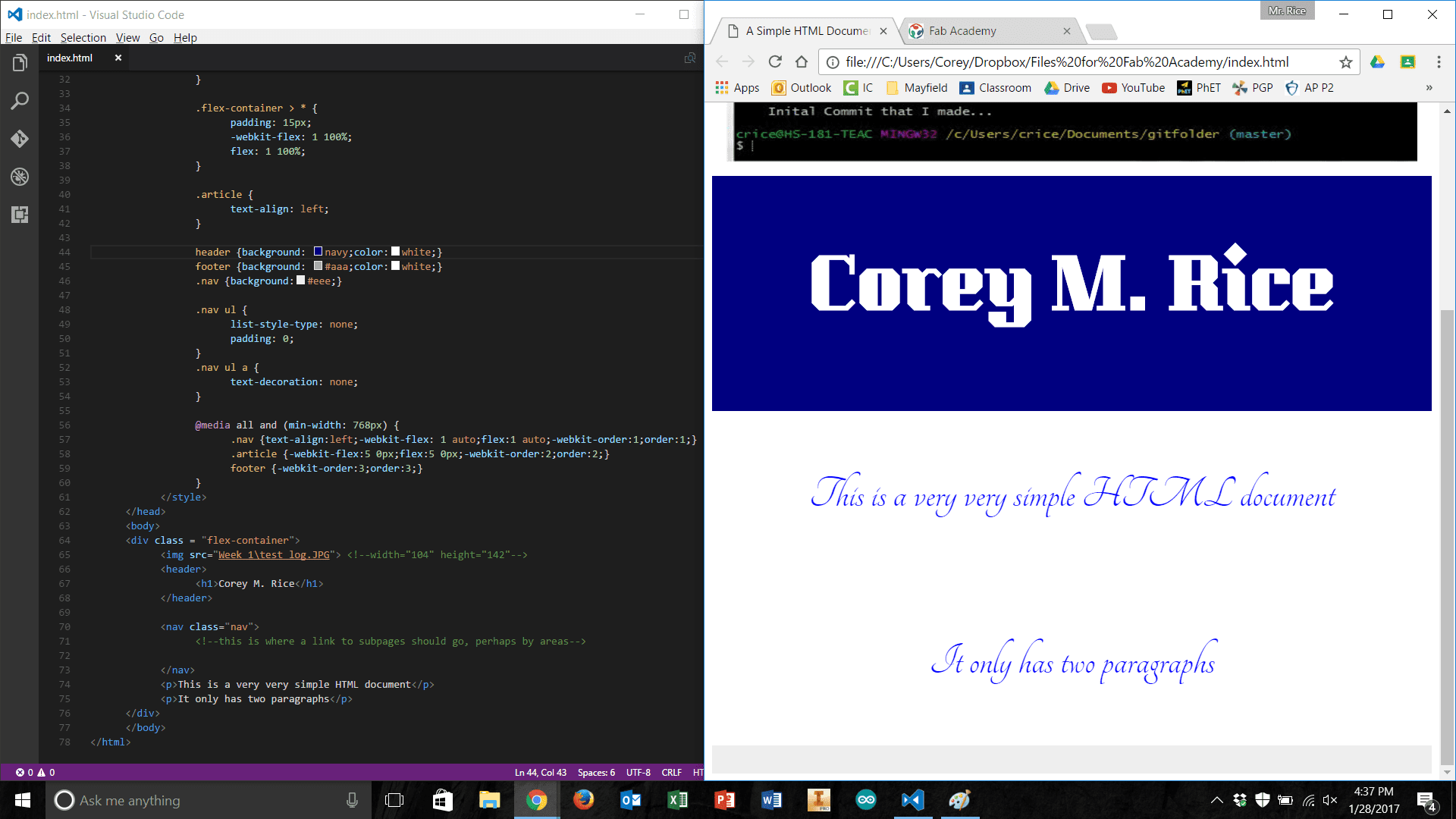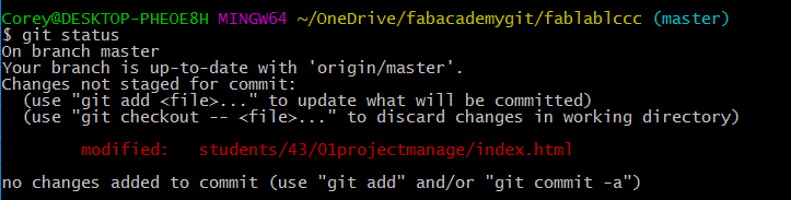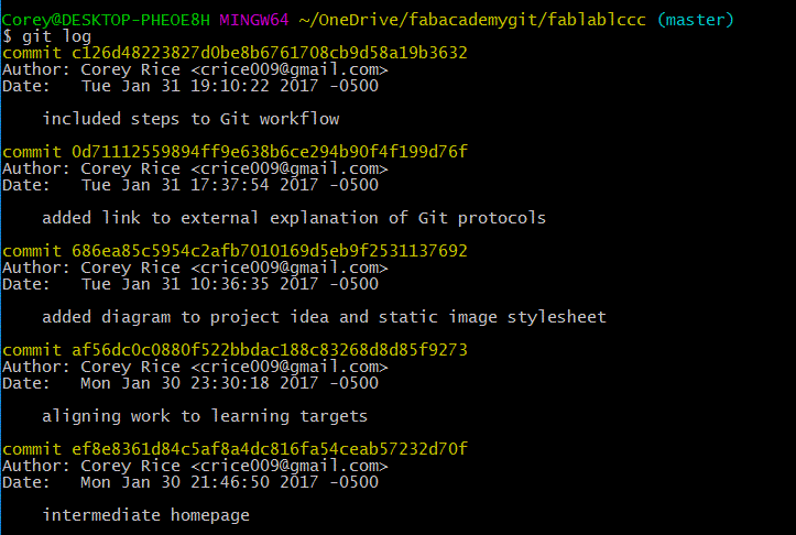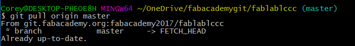 Building the file structure and paring down the website versions to their simplest necessary forms went well. I had a few simple pages for “About Me,” “Final Project Ideas,” “Weekly Projects,” and a home page. I also built a ‘stub.html’ that could be used for future weeks' assignments. With a little editing of the CSS and HTML I also ensured that the styles were uniform across all pages and that I could set-up a different looking home page in the future. Once this work was done, I emailed my local instructor, Scott Zitek, for more information about how to upload my web development work. I had looked over some instructions located on the Fab Academy website, for uploading my work using Cygwin and Mercurial. However, it turned out this method was out of date. Zitek directed me to fablabs.io and git.fabacademy.org where I was quickly able to make accounts and get started. At this point, I was thankful for my recent exploration of Git (described above) – it greatly expedited the uploading process at this point. The only real slowdown was establishing my SSH key, and connecting that to GitLabs. However, once this was done, the commit and push process was incredibly simple and I was able to push a few changes to my student folder. Once this process was complete, I was anxious to see my website be hosted on the class archive.