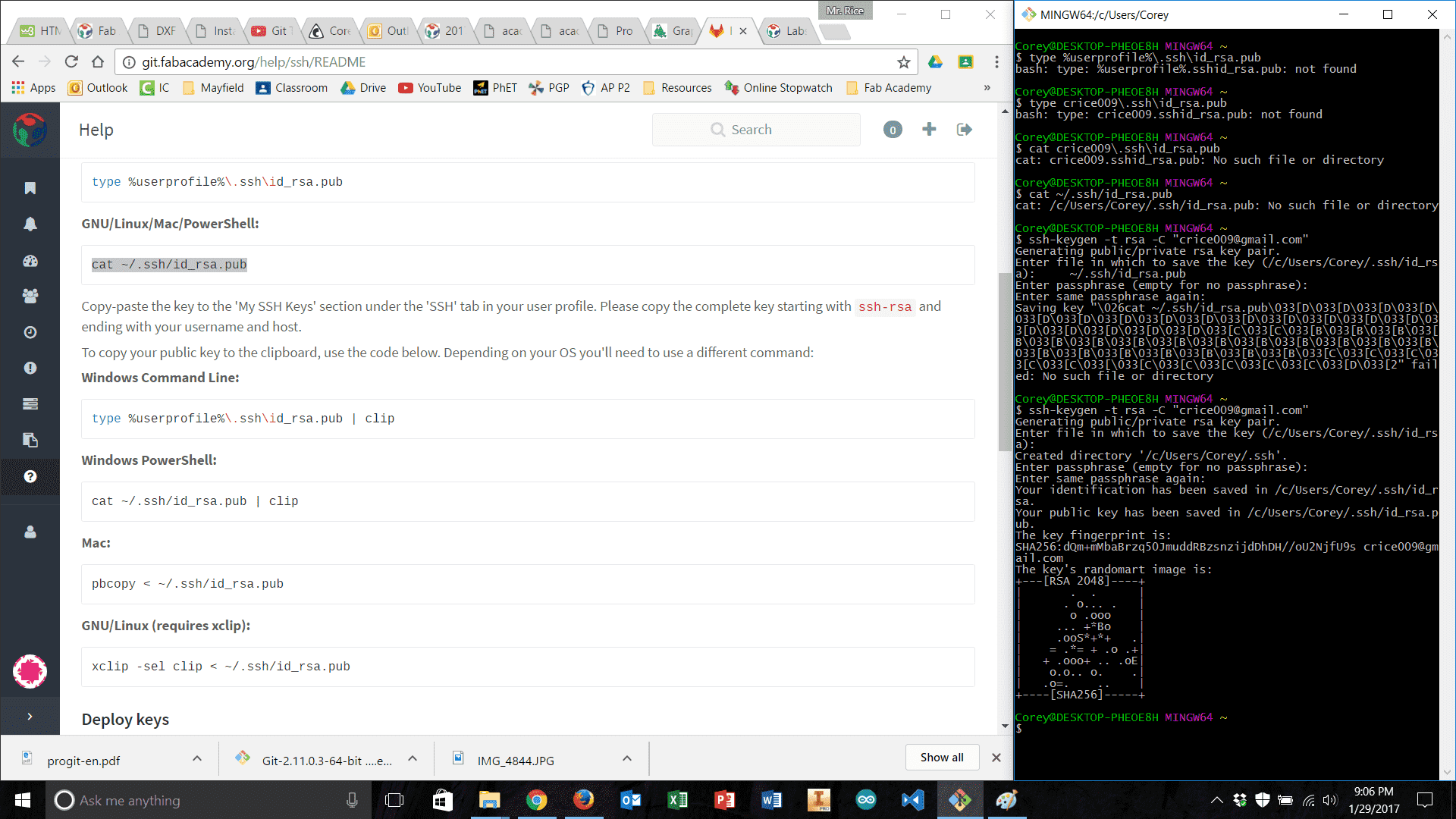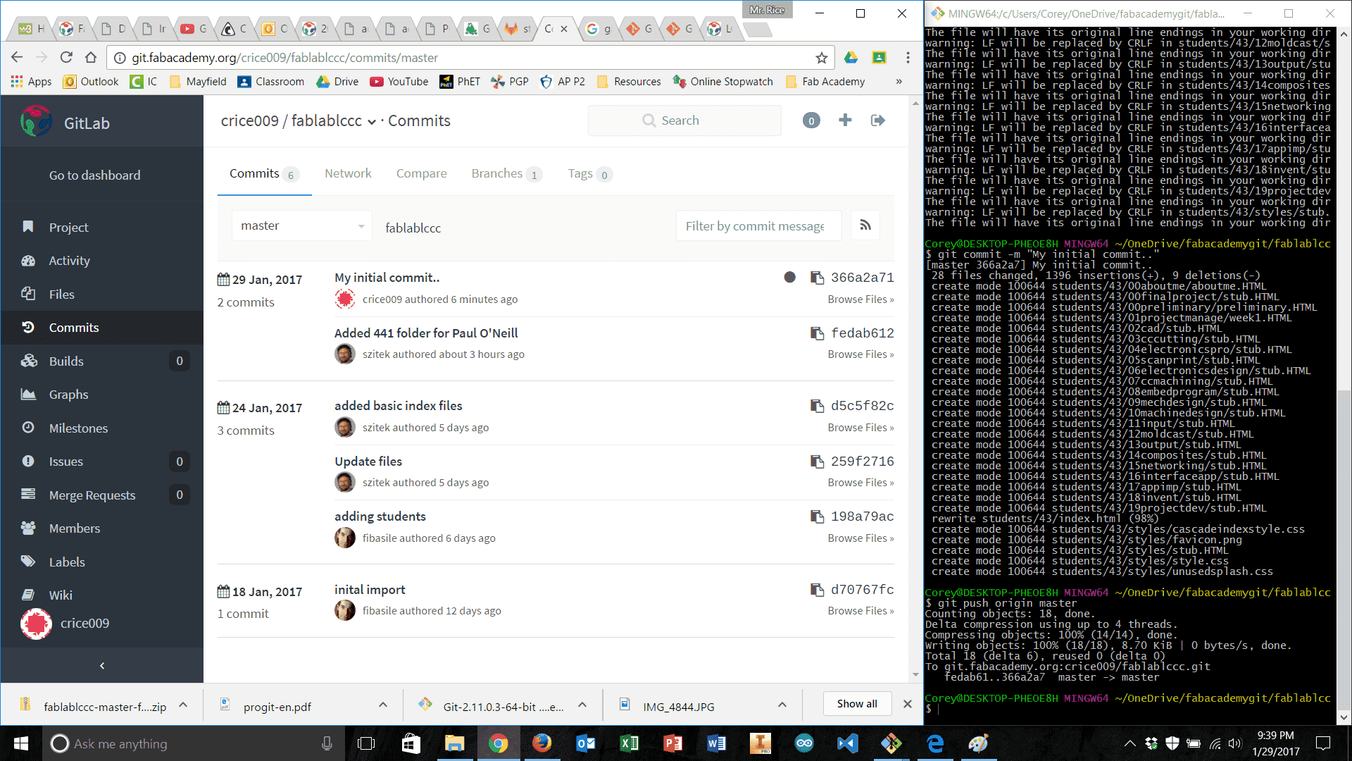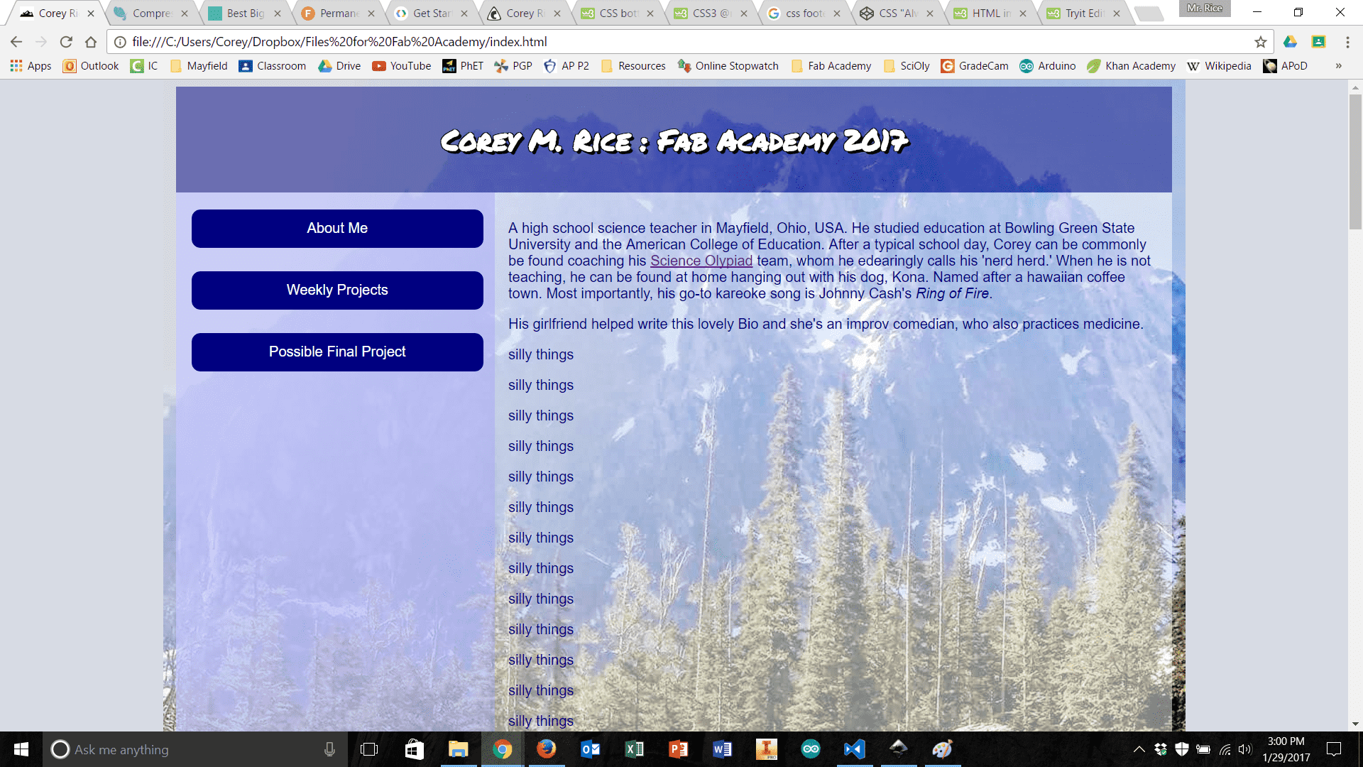 Building the file structure and paring down the website versions to their simplest necessary forms went well. I had a few simple pages for “About Me,” “Final Project Ideas,” “Weekly Projects,” and a home page. I also built a ‘stub.html’ that could be used for future weeks' assignments. With a little editing of the CSS and HTML I also ensured that the styles were uniform across all pages and that I could set-up a different looking home page in the future. Once this work was done, I emailed my local instructor, Scott Zitek, for more information about how to upload my web development work. I had looked over some instructions located on the Fab Academy website, for uploading my work using Cygwin and Mercurial. However, it turned out this method was out of date. Zitek directed me to fablabs.io and git.fabacademy.org where I was quickly able to make accounts and get started. At this point, I was thankful for my recent exploration of Git (described above) – it greatly expedited the uploading process at this point. The only real slowdown was establishing my SSH key, and connecting that to GitLabs. However, once this was done, the commit and push process was incredibly simple and I was able to push a few changes to my student folder. Once this process was complete, I was anxious to see my website be hosted on the class archive.