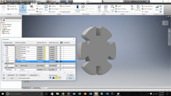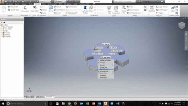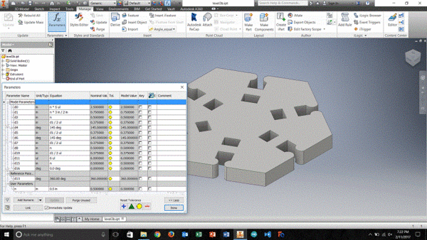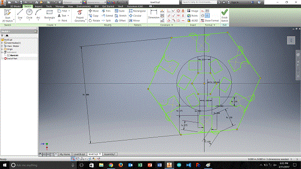 Saturday I was in Detroit and back at the problem. I was at The Bottom Line coffee shop, and finally found something. Inventor has a feature that will ‘auto constrain’ parts of a sketch, and I figured I should try it. What was there to loose? I set up this untested function, and there it was. My answer. I had been neglecting to constrain my design elements in the ‘horizontal’ direction they had been shifting previously. I just needed to constrain them relative to the radius of the hexagon. It all made sense in hindsight. Frustrating. However, we all move on and get better with experience. This experience typifies the ‘grit’ that I talk about with my own high school students. It is critical that my students (or anyone) work through frustration and find a solution.