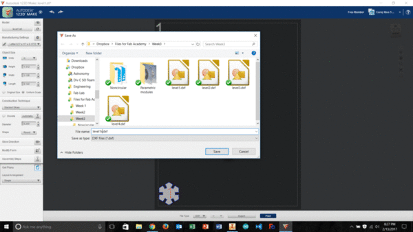 The next task was figuring out how to transfer the models I had designed in Autodesk Inventor to a laser shape. My first attempt to make this transfer from 3D to 2D information used 123D make. Using this software, I was able to export my 3D model into a DXF file, which Corel was able to accept directly. However, there were many messy scaling options that had to be selected, and the output vector traces were rather inelegant. They were broken into many different partial paths, and the scaling seemed a little off. I laser cut a bunch of these parts anyway, needing to scale them down a little to make it work. I knew this was ‘cheating’ but I was tired and wanted to be done for the night.
