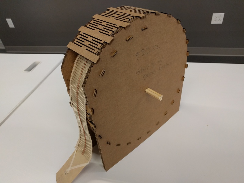 The most challenging part of the process was the iterative design needed to ensure that everything fit together well. This was a time for parametric design to shine. Although the bendable parts worked on almost the first try, making the corresponding sides took much more effort. Not only did the sides have to match the bendable pieces, but they also had to fit onto the 12x24 inch laser cutter bed. Oddly, this meant that the octagonal reels needed to be made slightly smaller. So, I placed the reels onto the laser bed. It turned out that the largest diameter measureable on the octagon was 12 inches, and too large for the dispenser sides to fit on the laser bed. However, I cut the reels to a circle shape with a diameter equal to the smallest that would stay tangent to the octagon. This trick made the reel small enough that I could fit the corresponding dispenser sides on the laser bed. However, trimming the reels was a bit nerve racking, as it required me to laser cut cardboard just above the brand new resistors, still on the reel. Once the reels could fit into the sides, I needed to be sure the sides were an acceptable shape. The curves of the slots and the exterior of the sides were designed to fit an equation curve that spirals outward.