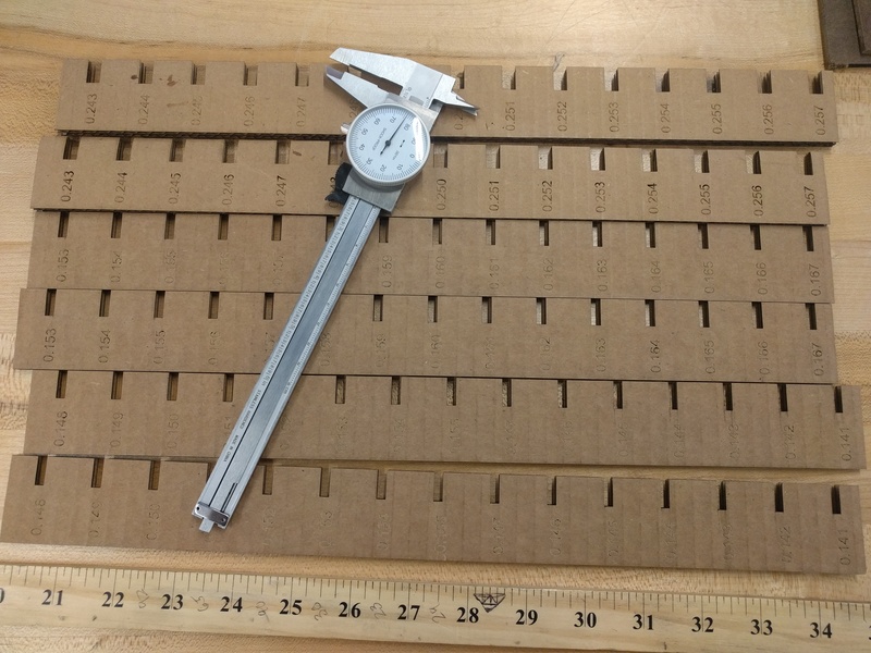 When I got home, I set to work building the parts that were part of the group project. Since I am geographically isolated from any Fab Academy peers, I simply had to produce this on my own. I used my roommate’s copy of Corel Draw 8, because I knew that would match the software I would use on Monday with the laser. The design was simple and, through a little dimensioning, I could easily build a quick testing rig for finding the right size for my parametric parts. I included the sized slots and raster labels, so that I could tell the size of the slots more easily. Cutting this was relatively straightforward on the laser, but I had to resize my designed parts twice while in the lab to get close to the size that I needed for the cardboard the lab had in stock. The core Idea of this method was to simply create a go/no-go gauge for measuring press-fit. If the slots fit, then the adjustment for the kerf was properly done. This method was selected for two reasons: 1) It compensates for two kerfs simultaneousy - one on each side of the slot. 2) The method does not require measurement and calculation, which eliminates the availability for any propogation of small measurement errors. However, I calculated from the results that my kerf from laser cutting was around 3 thousandths of an inch.