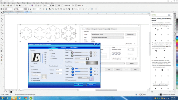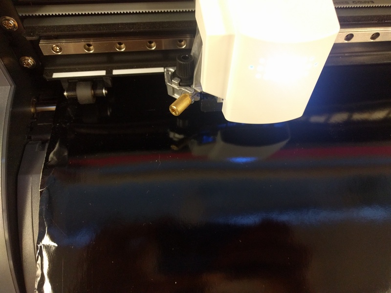 So I began cutting. This is just as easy as the laser: the machine cuts hairlines in the Corel Draw file. The core of the work translating the file information into toolpaths. Additionaly, you need to do some work to inform the machine about the size of the material it will be cutting. The vinyl has to be aligned under the cutter, with the top rollers in designated areas. After clamping down the machine on the material, you need to run a routine to have the machine measure the cuttable size. From there I use those dimensions to change the page size on Corel Draw. After that adjustment, it is ready to print as easily as any other printer.