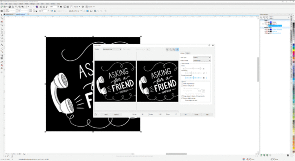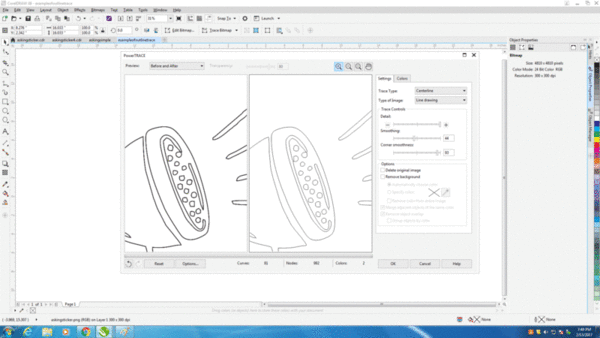 First, I imported the jpeg into Corel. This is just a raster image, and not very useful for the vinyl cutter. So the first step was to allow the software to trace the file into vector paths that can represent the jpeg reasonably well.