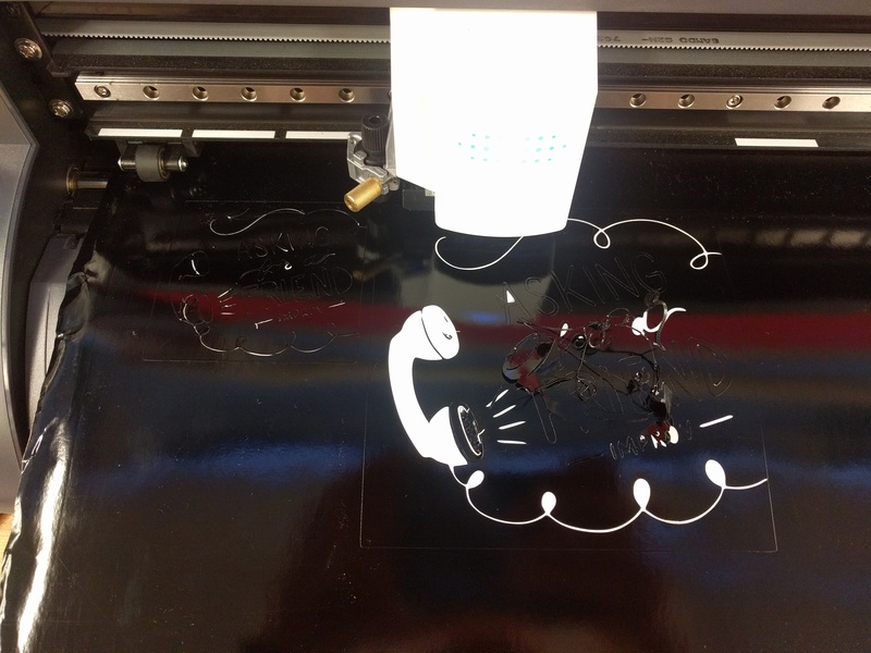 I set a six by six inch sticker to cut, and tried to weed out the parts I didn’t need. This went reasonably well, but the delicate nature of fome of the weeded elements, along with the embedded small ‘floating’ parts that I wanted to keep meant that weeding was a tedious task. I lost a few of the floating pieces in the first go, but it generally worked. I masked this smaller sticker, and kept it to try and transfer it later. I have still not put it anywhere; otherwise, I would have shown it. However, since this Tuesday was Valentine’s day, I thought it would be nice to cut out four larger stickers to give as gifts to my girlfriend’s all female Improv troop (Life has taught me how to be a good boyfriend). I cut these four stickers to be eight inches on each side, and the weeding went much better. A little masking, trimming, and I had four nice gifts to give. I have given all of these four stickers to my girlfriend. She appreciated it. I have not heard back from the rest of the troop. Perhaps I will update all of you with their feelings later…