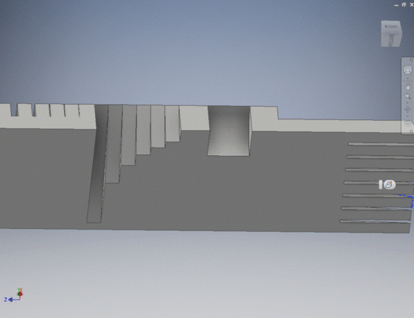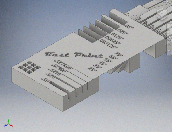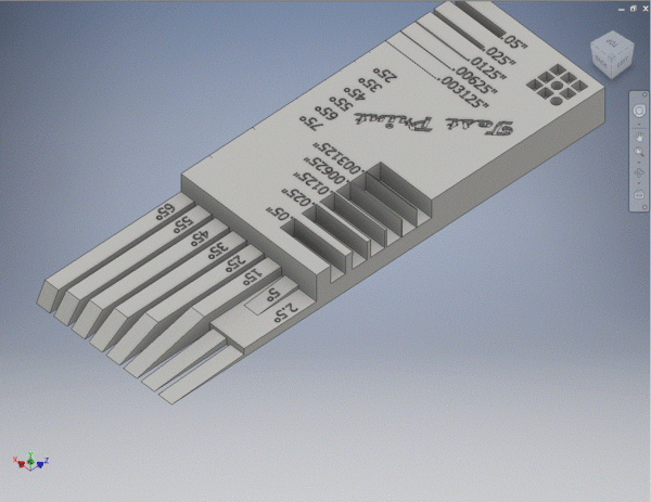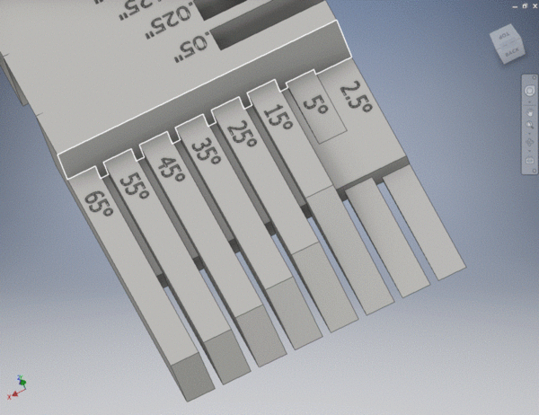 I knew I wanted to make sure that I hit all of the marks set forth by Gershenfeld in the lecture and assessment book: minimum printing and overhang angles, wall and gap thicknesses and minimum text sizes. This meant that my test print model would need to include all of these features. First, I set out to design separate incline angles of decreasing degrees. The idea with this feature would be that I could identify what angle was too sharp to be resolved by the printer accurately. All of the model wedges would terminate at the same endpoint; but, if the print was shorter, I knew it would be too sharp to design for a real-world.