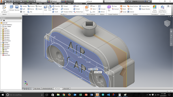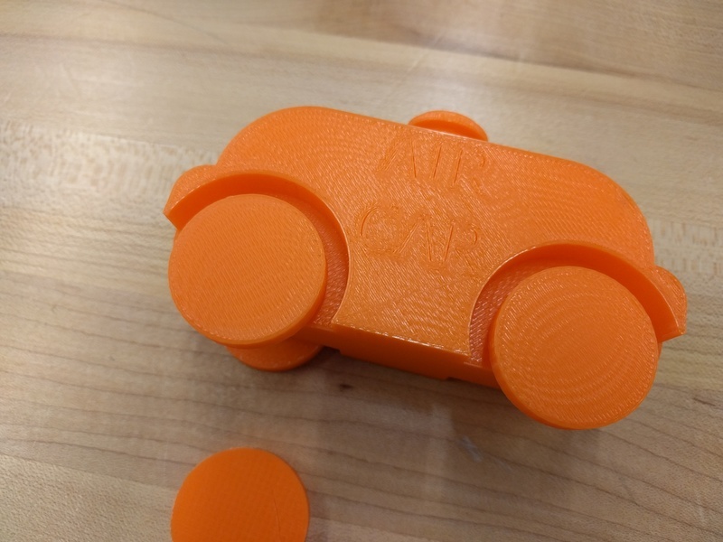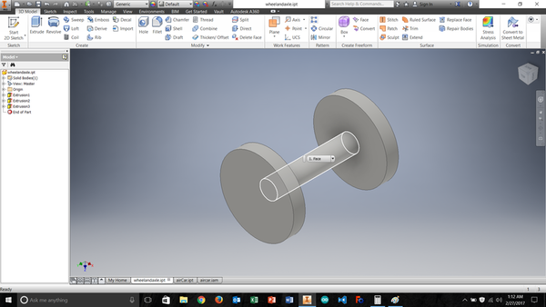 Consequently, I decided to produce a new model that unambiguously meets the week’s criteria. I wanted to design a car that is propelled by air pushed through a windpipe that a mill could not cut, and is printed with the wheels in place. To achieve this I had to do some calculations. I designed a pair of wheels and axle that is 1.5 inches long. The car body is also 1.5 inches wide and the first iteration had wheel wells that were only 50 thousands of an inch larger than the wheel themselves.