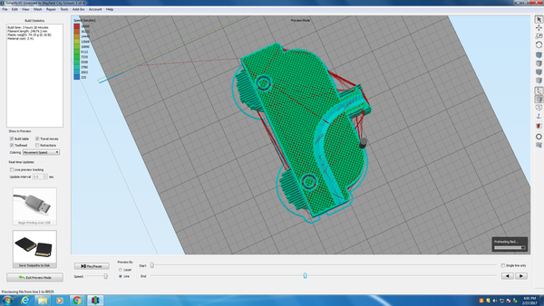 So I sliced the model again on another computer’s version of Simplify3D and loaded the gcode onto an SD card. Normally Simplify3D will let you pass the gcode to the printer of USB, but I needed to use the same printer that was connected to the computer with a problematic version of simplify 3D. (All the other printers were in use.) In any case, I could load the SD card into the printer and print the gcode from the SD card directly. I left the lab tonight with this print still going on the machine. I look forward to the outcome in the morning.