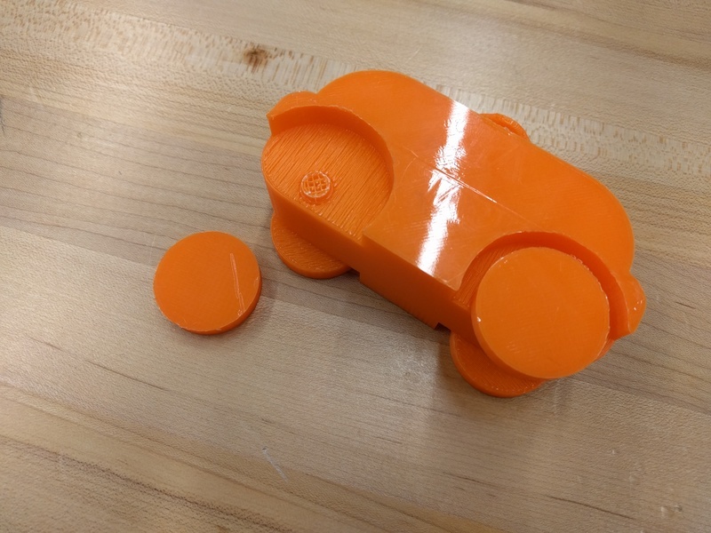 So, a second iteration was made. This version had much more space around both the wheel and axle, but the wheels were still about as thick as the wheel wells. Not a terrible plan but, without supports between the wheels and car bodies, the inside of wheels that printed on top were ‘stringy’ and thus jammed up the car. So, on to revision three.