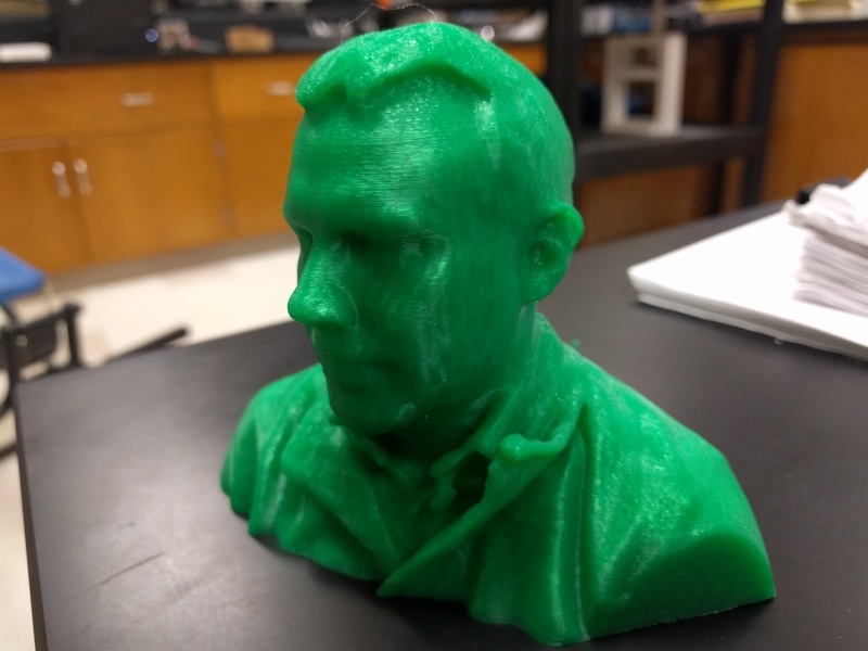 3D scanning is delightfully fun. It lets you take a real object and, using a series of 2D photos, stiches together a 3D model of that object. There are, of course, other technologies to get this done. Certainly several of those technologies must be better or worse at 3D scanning. I specifically used a borrowed a 3D systems Sense2 scanner. The process was delightful. The software is beautifully configured to work easily. I had one of my students (the one I mentioned earlier who works for MakerGear) sit in a chair and spin as I pointed the scanner at him. While it didn’t come through perfectly on the first try, the second went much better. The software even has a few touch-up features built-in that make the process convenient and fun. Honestly, this process plays more like a toy than a tool. It was just that easy. So I had the same student scan me. How could I not? Once the scanning was complete it was easy to drop the exported stl files into Simplify3D and prepare the print. It took 10+ hours, but I would say it was worthwhile.