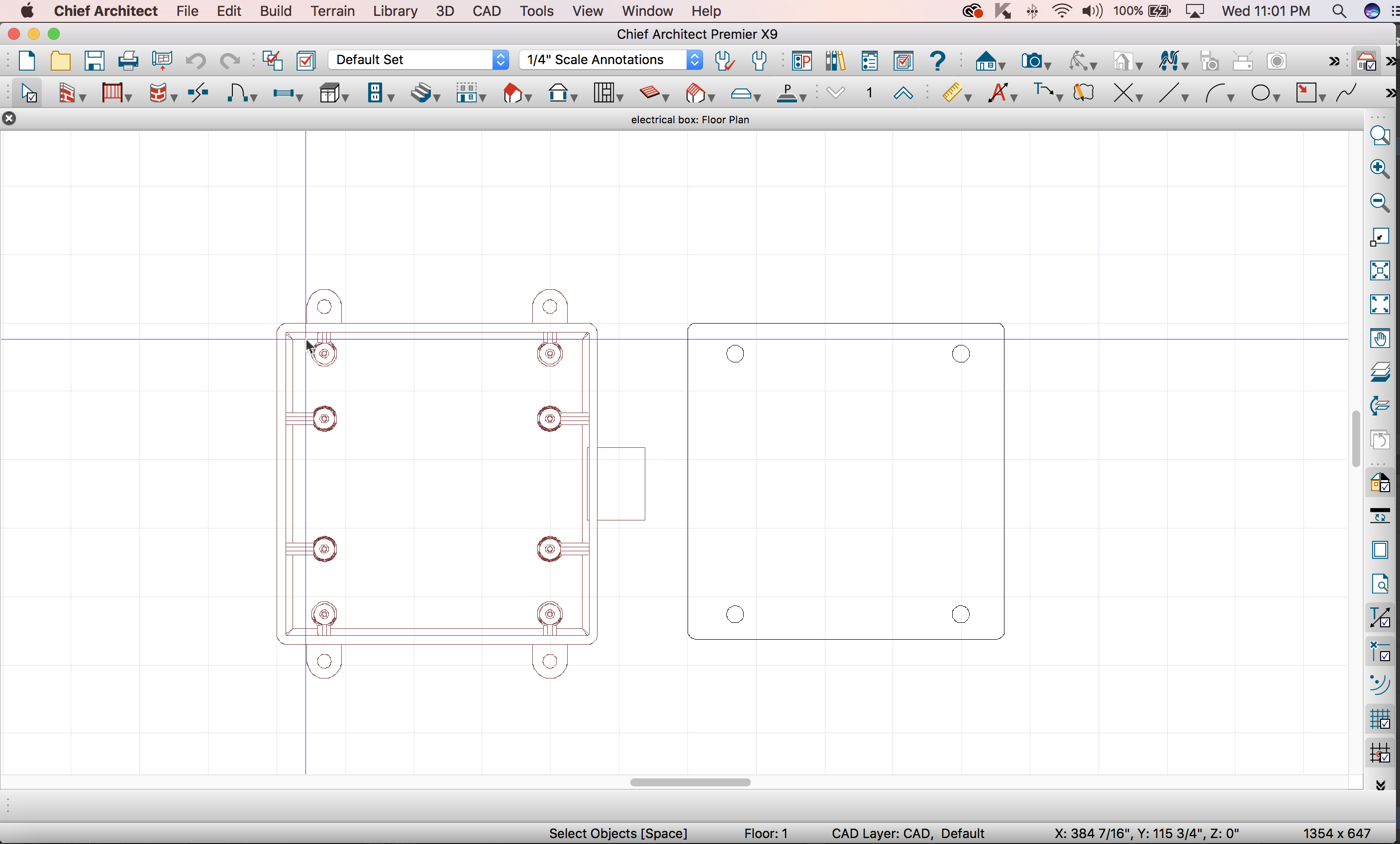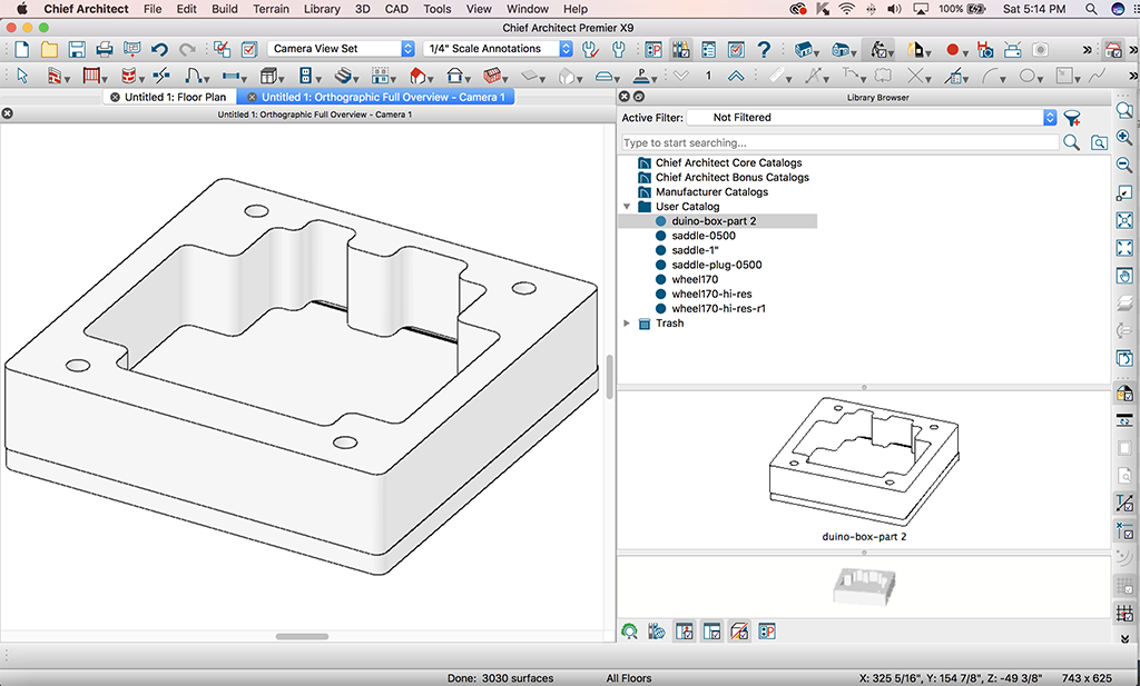 CorelDraw 5 to output the work to the benchtop laser cutter. I did not master exporting from Antimony. I did some simple computer-controlled cutting with Corel. I did do some computer-controlled cutting with Solidworks, so I decided to combine the assignments together so the screenshots would make sense. In regard to designing a final project using 3D software, including animations, the learning curve was too steep to accomplish this on Solidworks. Autocad was having issues with having software available to download. I reverted to a CAD package which I had some familiarity with, called Chief Architect, which is a 3D architectural modelling package, with some parametric functions pertaining to building design. I did find that Antimony is very useful in modelling objects that import very easily into what is called a "User Library" of objects.