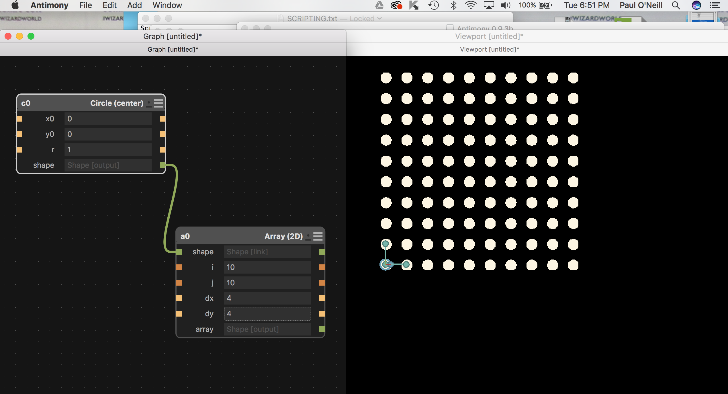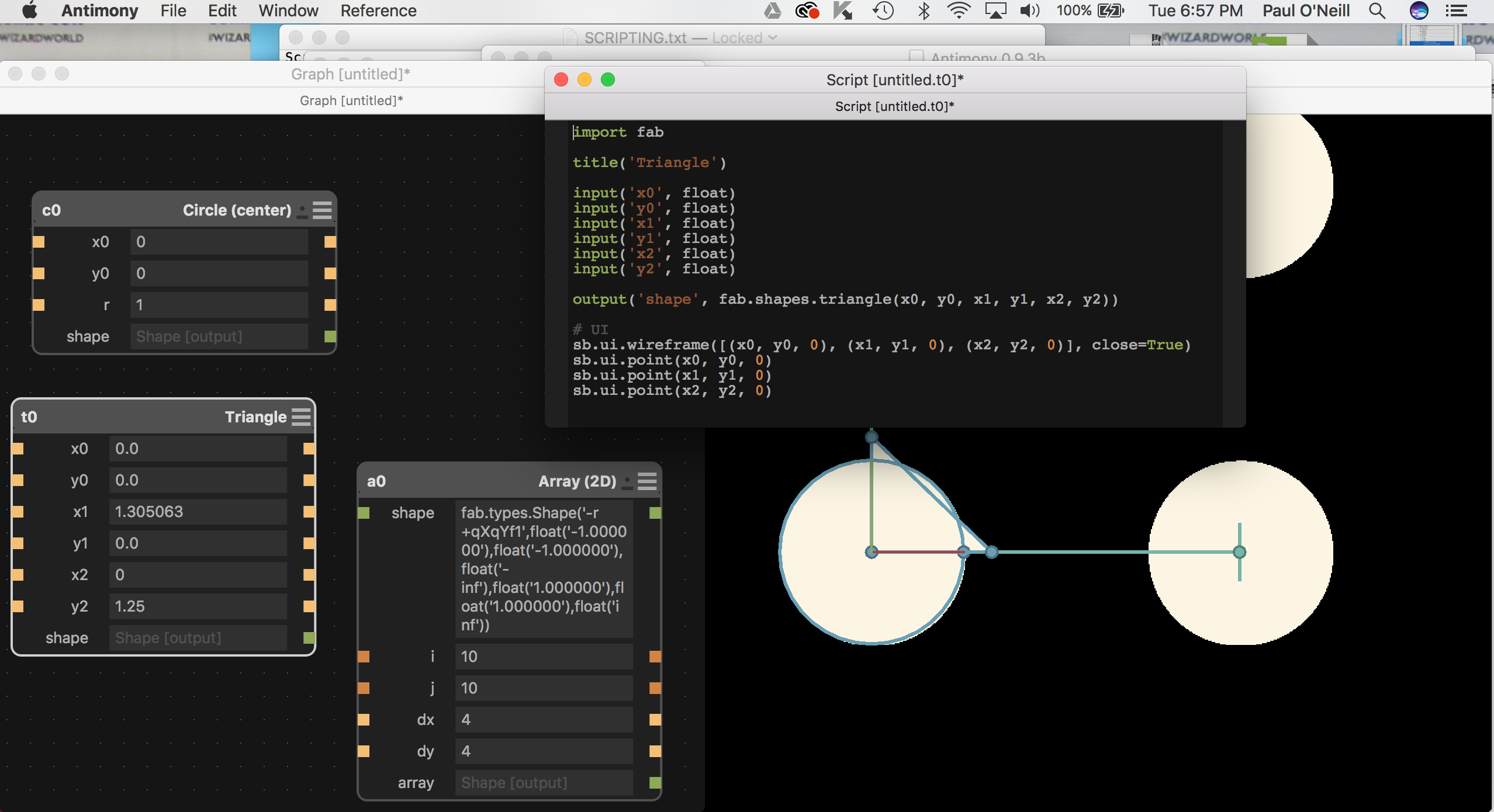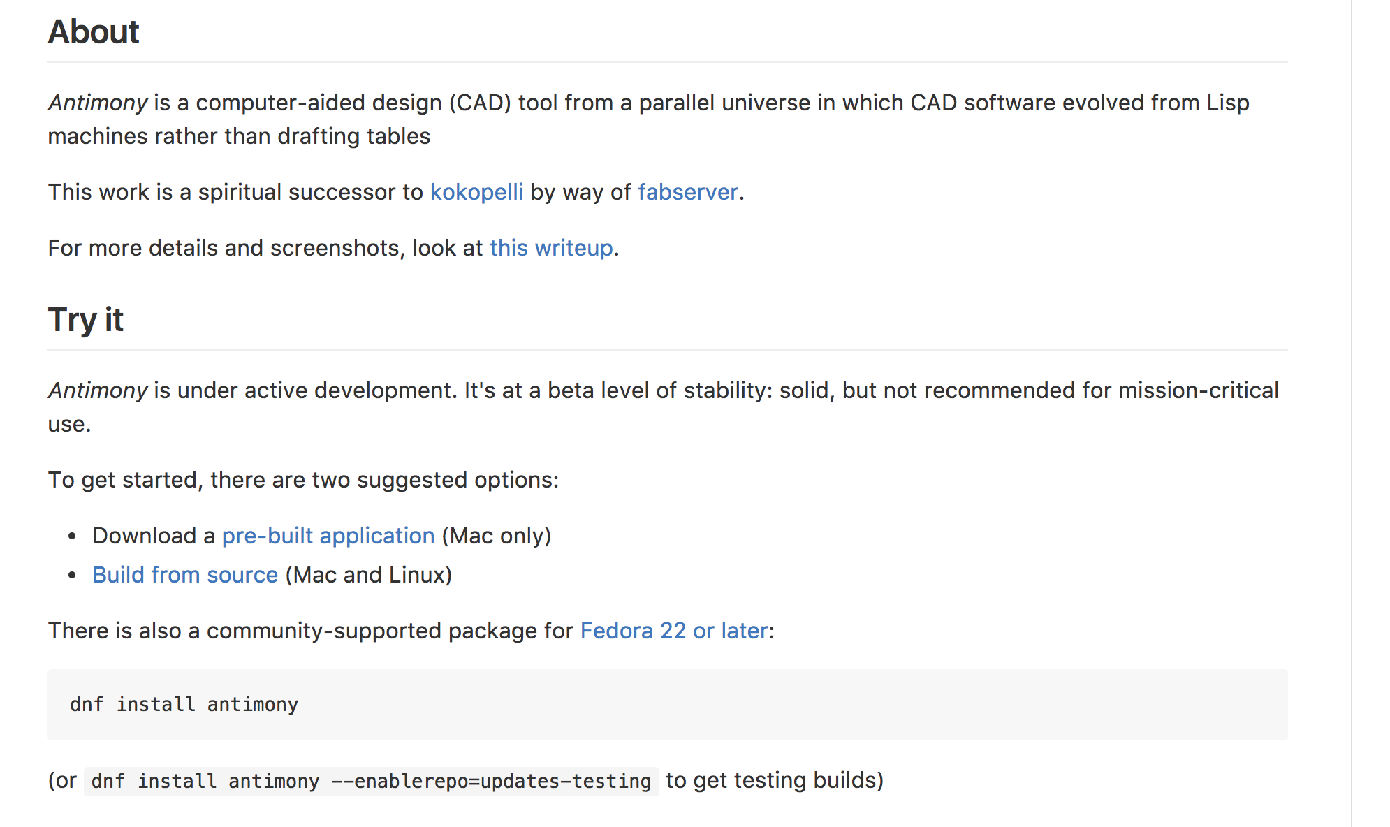 Nice enough for Matt to metion it is not a commercial package. Matt talks about how Antimony evolved from a parallel universe where there are no drafting tables. I take this to mean that it is a CAD package for programmers, not architects. I'm liking the perspective.