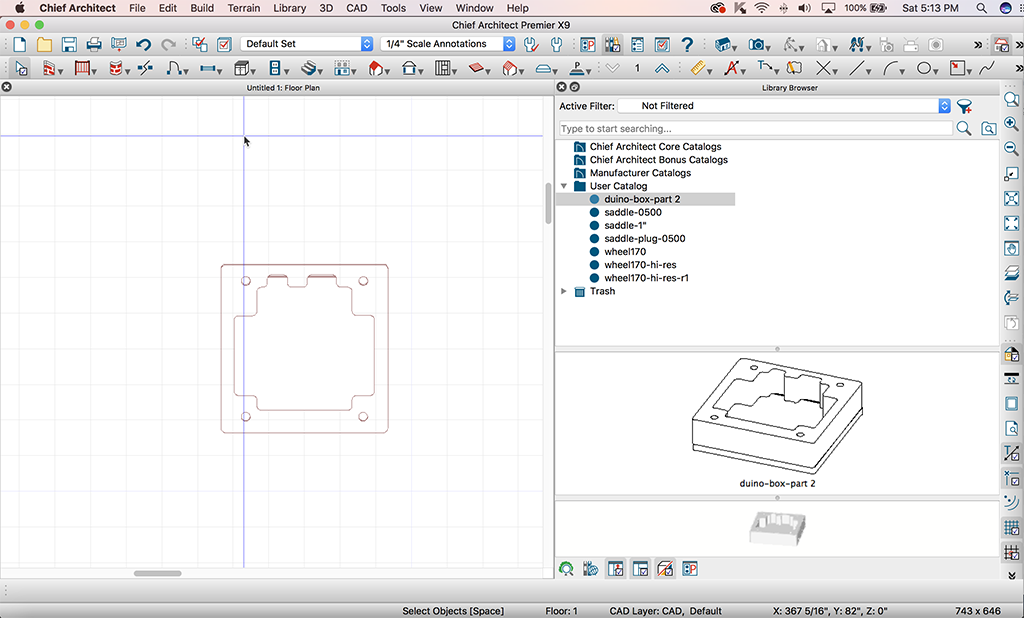 I next draw a plan for my "Arduino-Box" by outlining and then modifying the line drawing into a polyline. I draw a seperate rectangular solid underneath the contoured polyline to create a solid bottom. Add the 3d model to the user library.