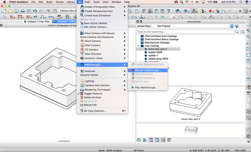 Select 3D - Walkthroughs - Record Walkthroughs. Chief will start recording until you press Stop Recording. Next, you are asked to save the file.