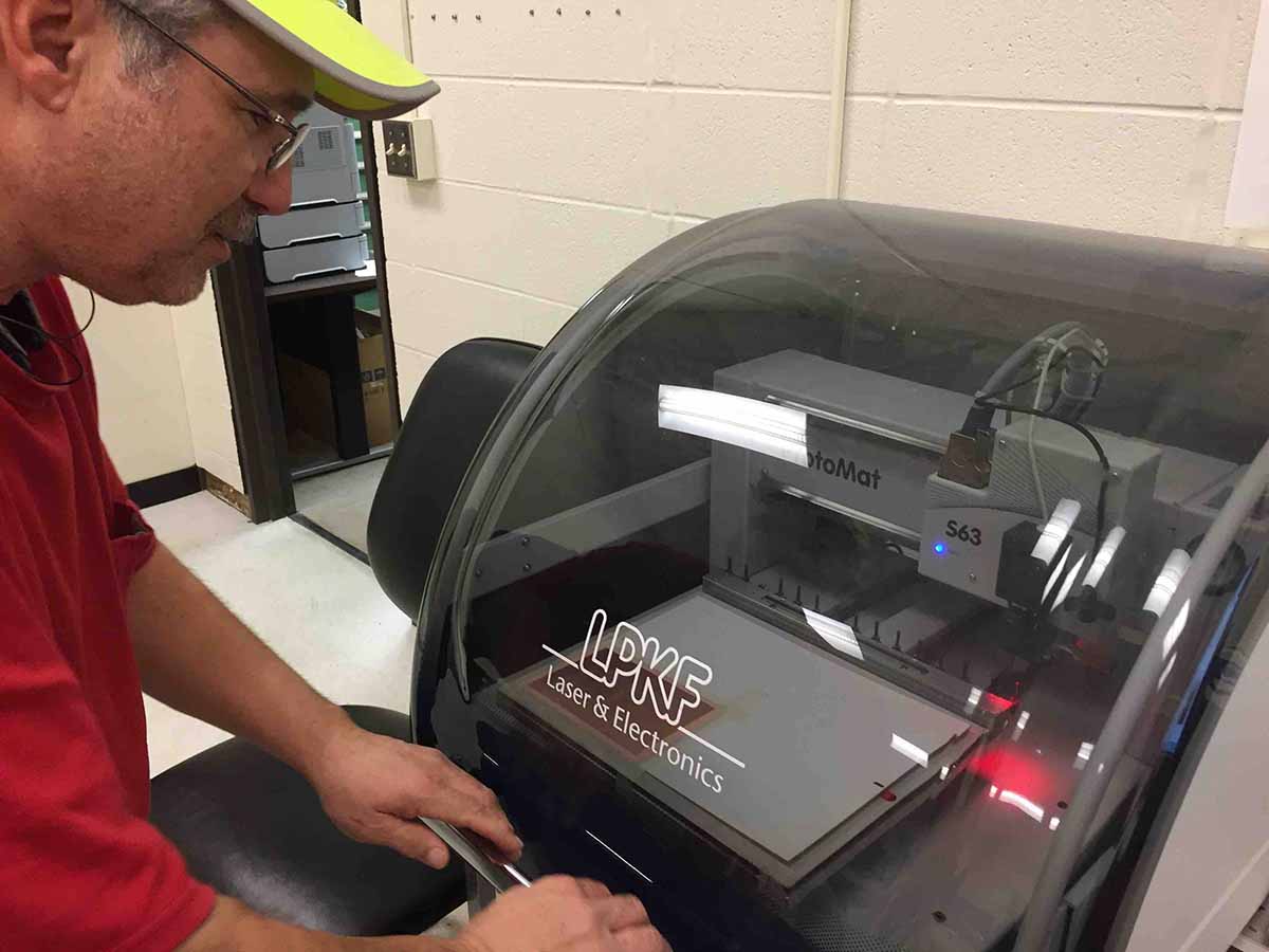 I started by reaching out to my instructor, Chris Rohal. Chris is the go to guy at LCCC for electronics. Chris explained that we would be using a different desktop mill this week, called an LPKF ProtoMat S63. The LPKF is a more sophisticated mill than the Roland. It has a high speed (60,000 rpm) spindle, and a 15 tool automatic tool changer. The most important feature of this machine is that it can successfully mill very narrow traces. I have never used a machine like this before, but I wanted to learn.