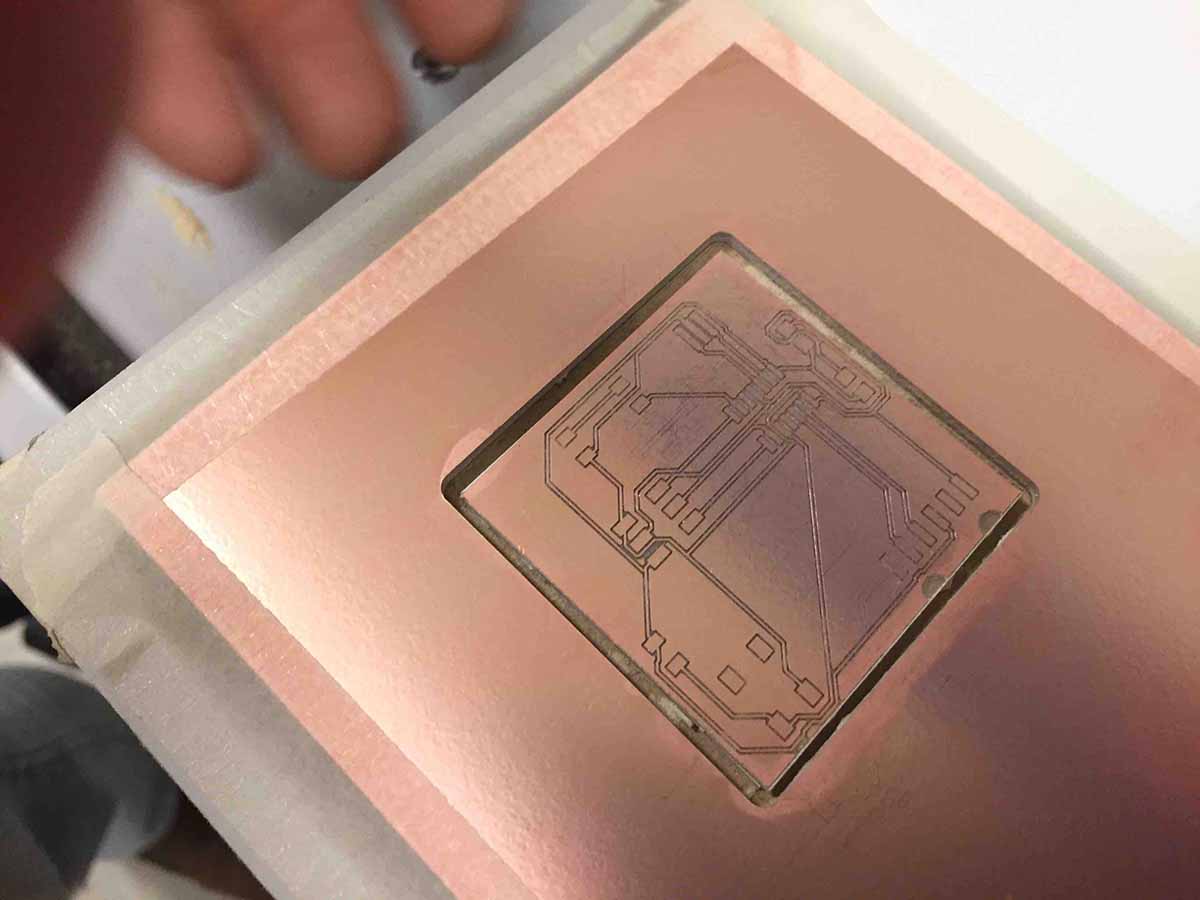 I put the PCB blank in the LPKF. With the LPKF, they suggest you tape the perimiter with masking tape. I did it that way on this board, but I have also used double stick tape with success as well.