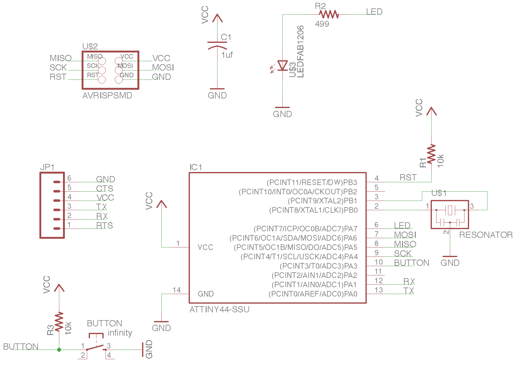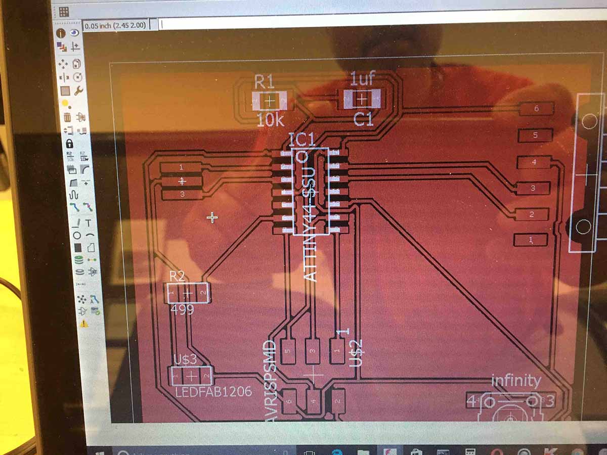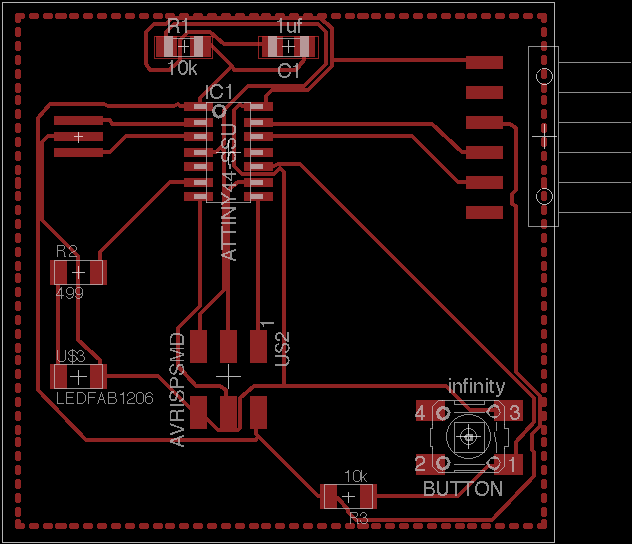 This week's assignment is to take an existing Fabacademy design, the hello-world board, and add a button and an LED (with current-limiting resistor), check the design rules, and make it (if you have time, test it).