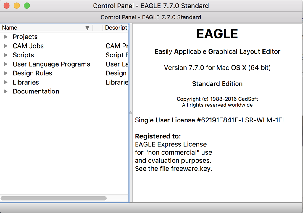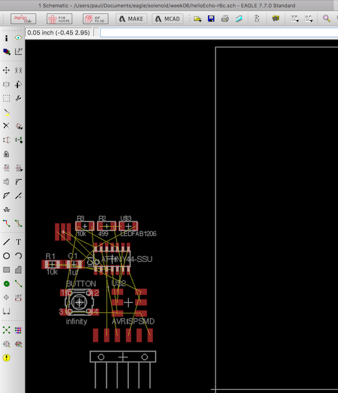 The other thing we would be doing this week is using a CAD package to modify a circuit board design. I have been doing everything on a Mac laptop, and Chris suggested I use Autocad Eagle. I had some issues installing the latest version of Eagle, a problem which is well documented among many users. I worked around this problem by using an older version of Eagle 7.7.0 which was developed by CadSoft, which was later bought out by Autocad. I believe the issue of being able to download the latest version for Mac has since been fixed. There is a Fabacademy tutorial on Eagle here: