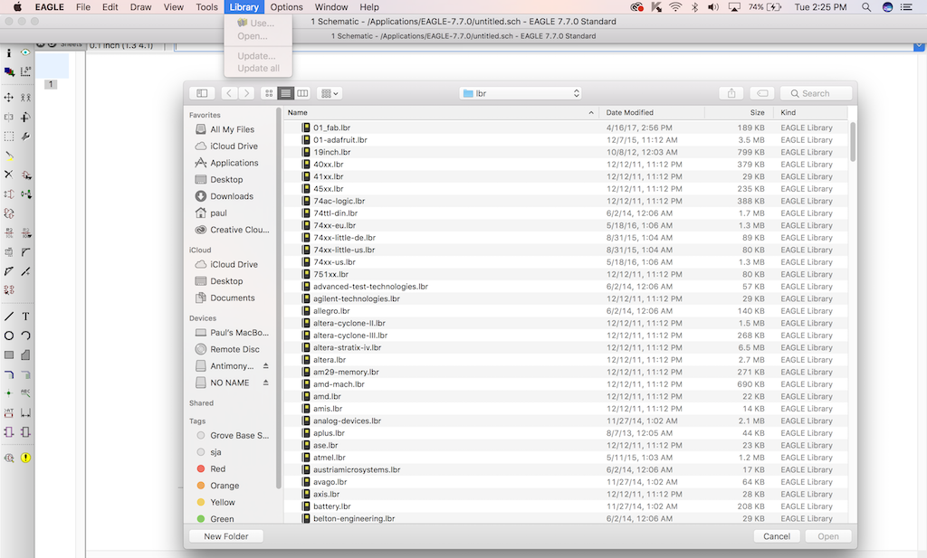 Next thing to do is to open up a parts library. I had downloaded the fabacademy parts library earlier. You can add the Fabacademy library by the command sequence Library - Open. Rename your most opften used libraries with numerals so they end up on the top of the list. This makes life much easier and pleasant when navagating. I also like using Adafruit's library, and many of the items you find in the Fabacademy library, you will find in the Adafruit library. The founder of Adafruit is a Gershenfeld disciple.