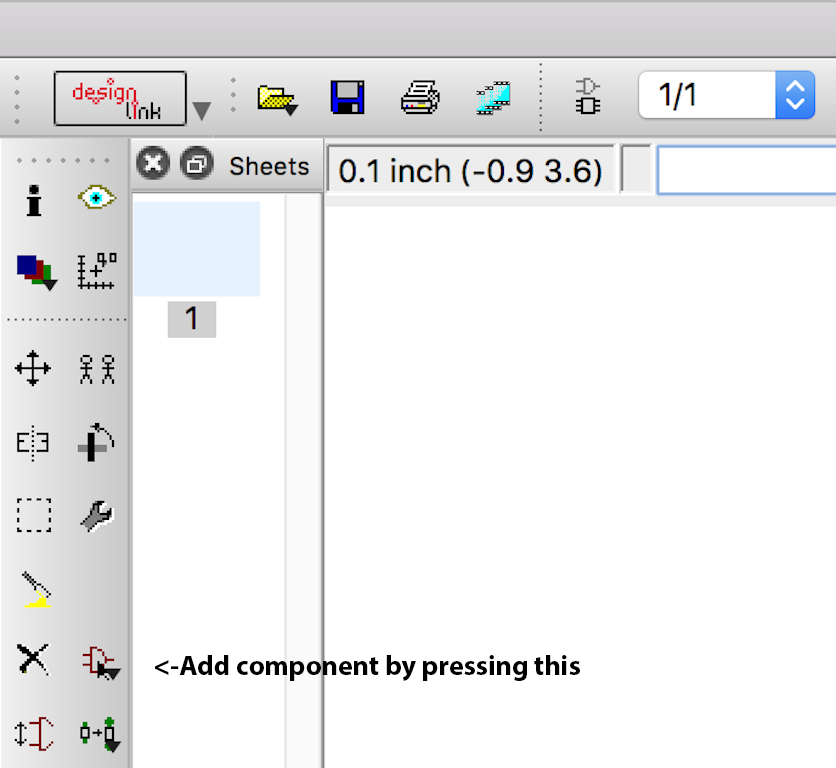 The left side panel is where you will find most of the tools you will need to complete your schematic. If your not sure what the icon does, mouse over it and wait for a yellow cloud to pop up to tell you what it is. The ADD component button is shown above. Press it to get to the next screen.