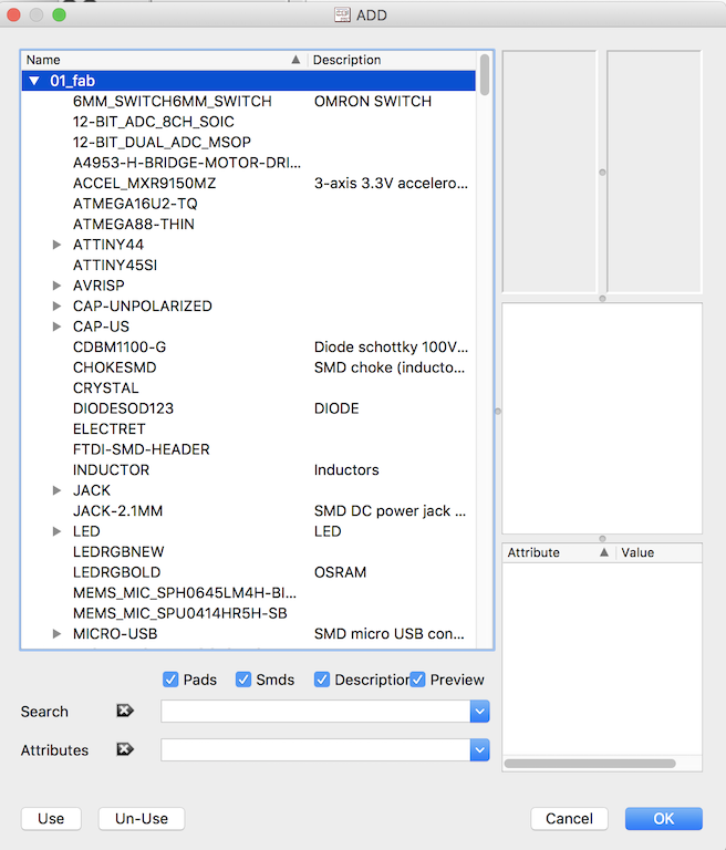 Click on 01_fab for the Fabacademy library. You get a pull-dowen menu of components.