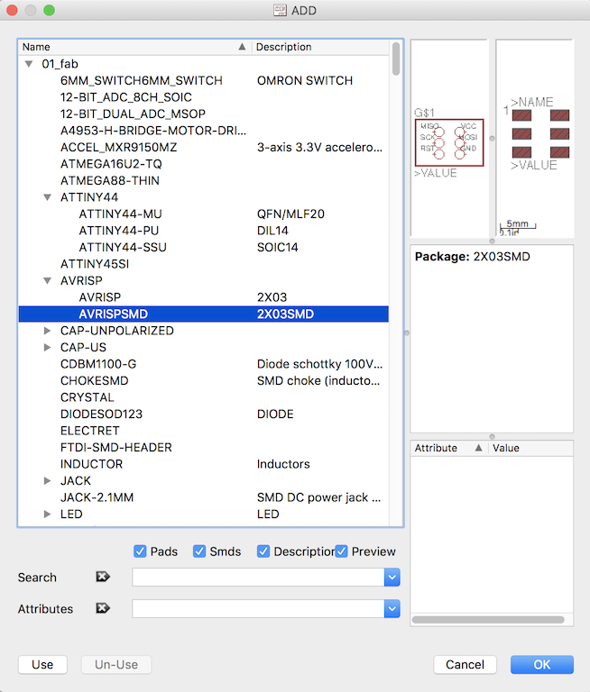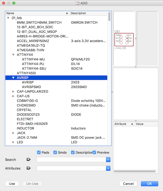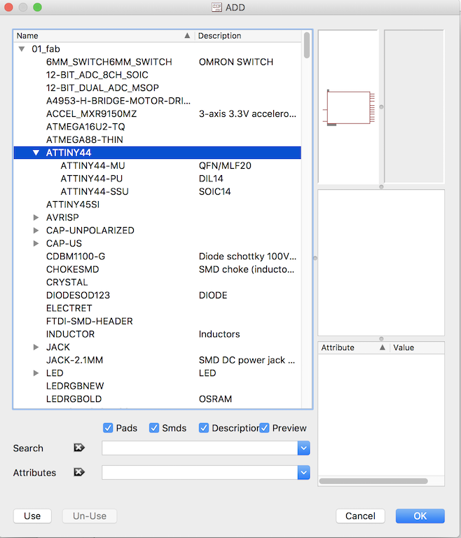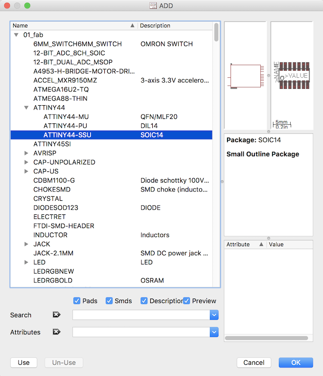 Next, look for the main component for this project, the ATTINY44. There are three flavors of this processor in the library. I don't know why. The one which I will use is the ATTINY44-SSU which is a surface mount, small-outline component.