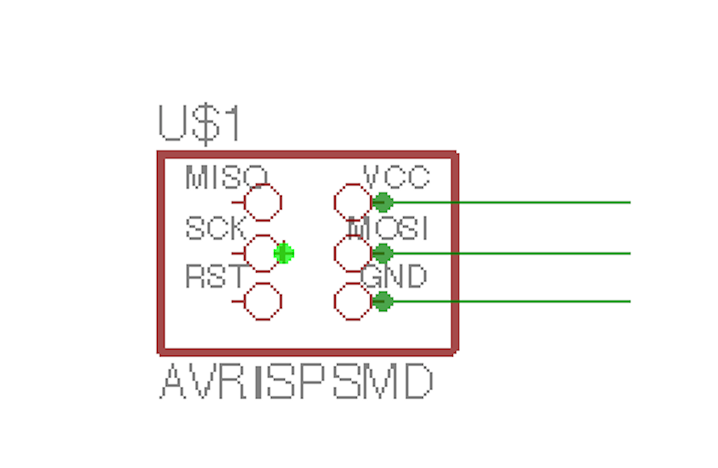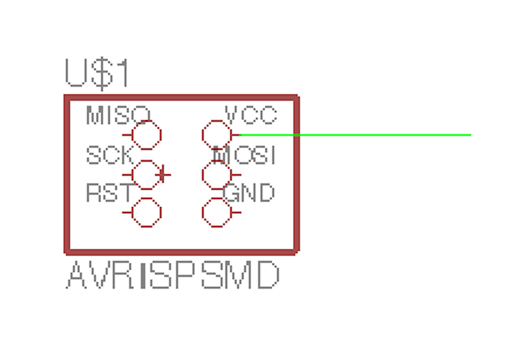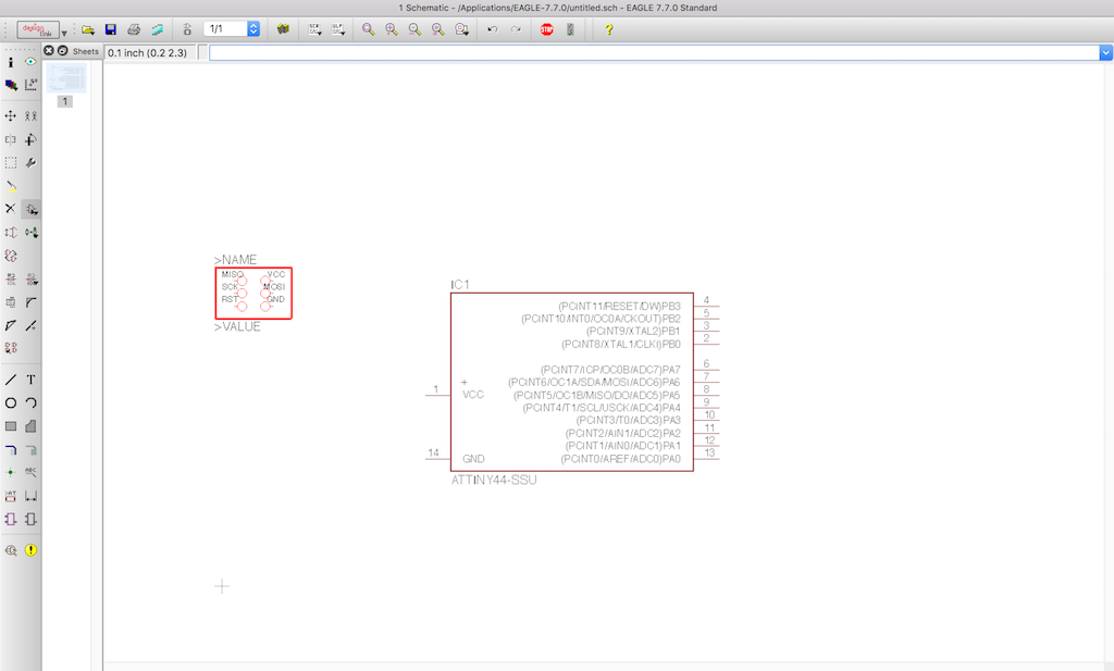 You click where you want to place the ATTINY44 in your schematic. Once you place it, it populates with all the named values for the pinouts. Press escape to extinguish adding any more ATTINY44's to your schematic. You only need one. Next, go add the AVRISPSMD component. This is a six pin header which you will plug in a ribbon cable. It is a surface mount component.