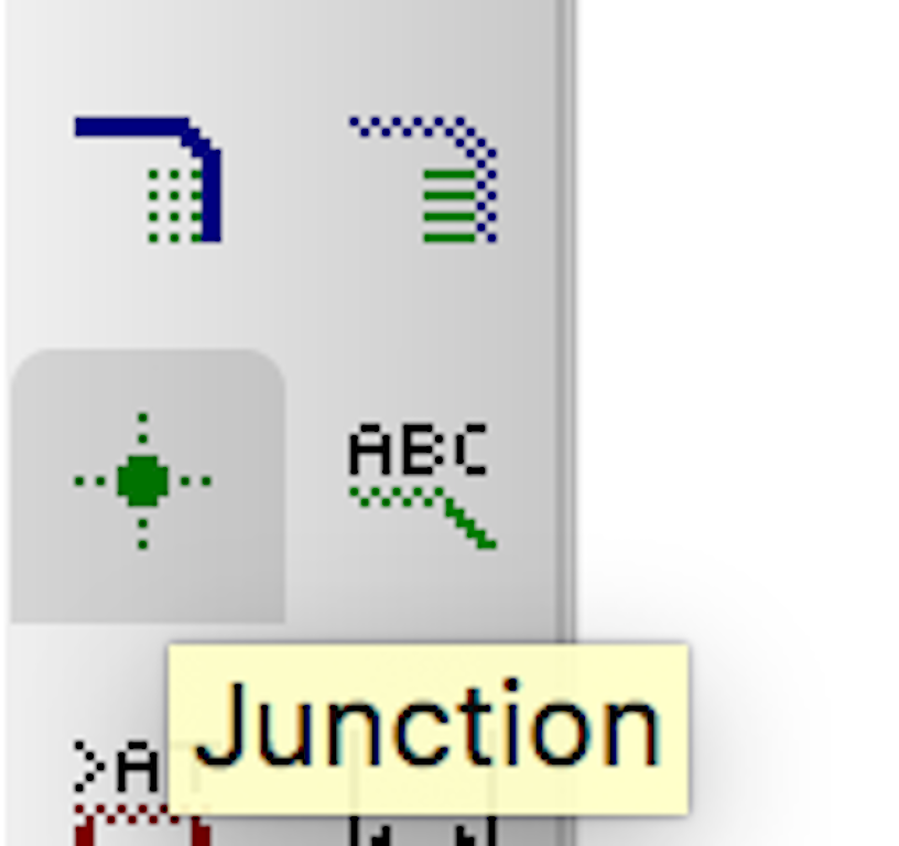 Draw wire from each pin of each device. You can drag the wire and connect to other devices later. I feel it is good practice to make sure the wire connects logically to the component with a junction. You do that by selecting the icon which looks like a little green dot, as shown below.