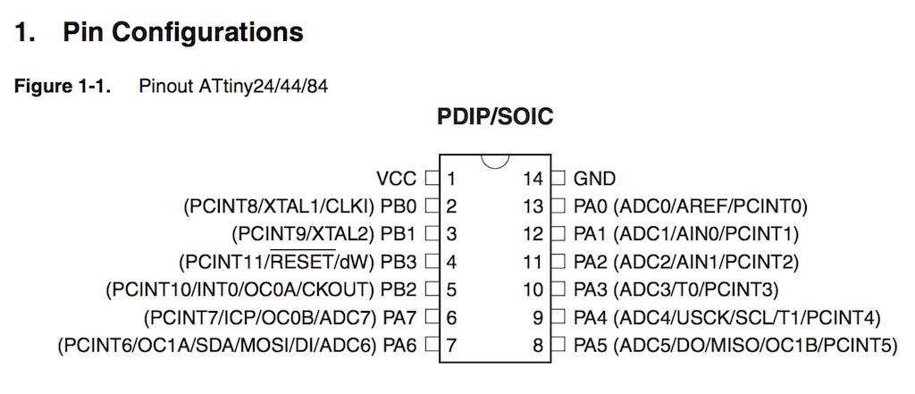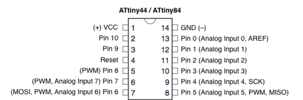 The next thing that needs to be done is translating ATTiny pins to their corollary Arduino pins. The following is a map from the High-Low Tech website: