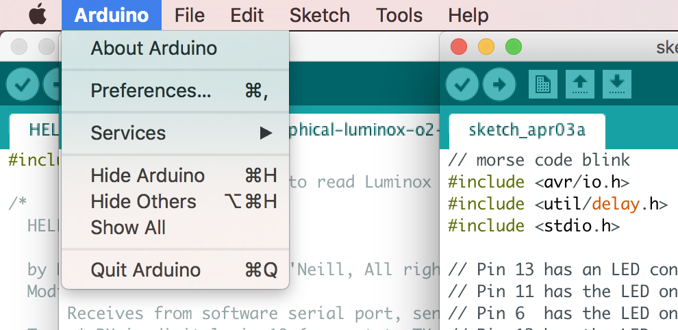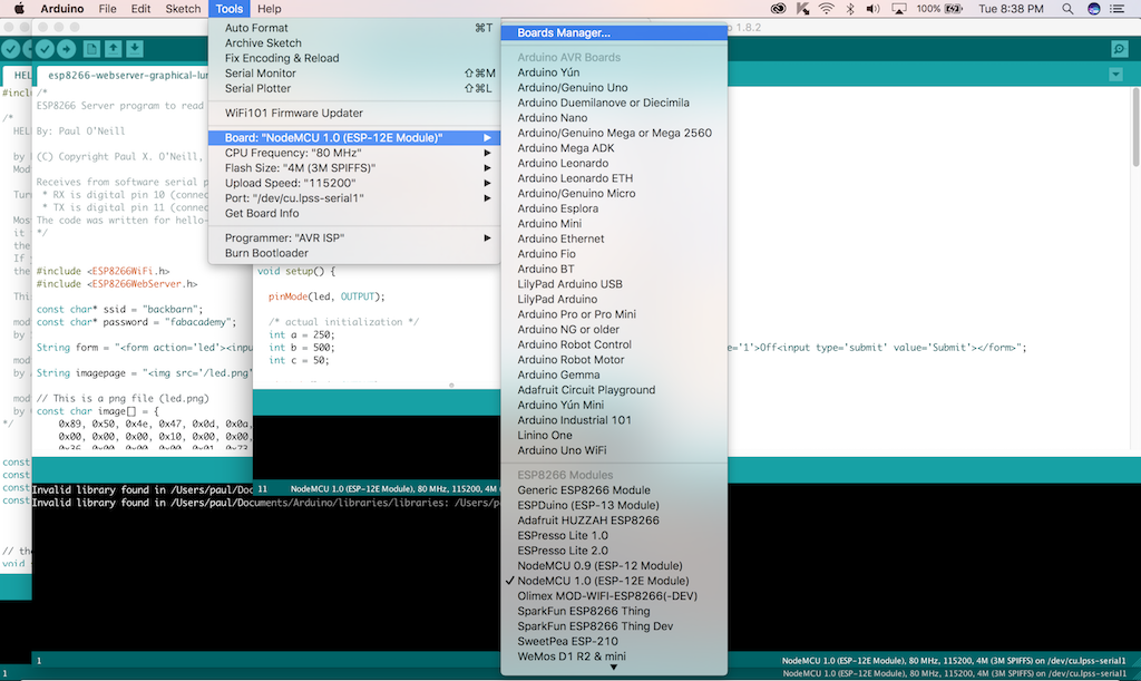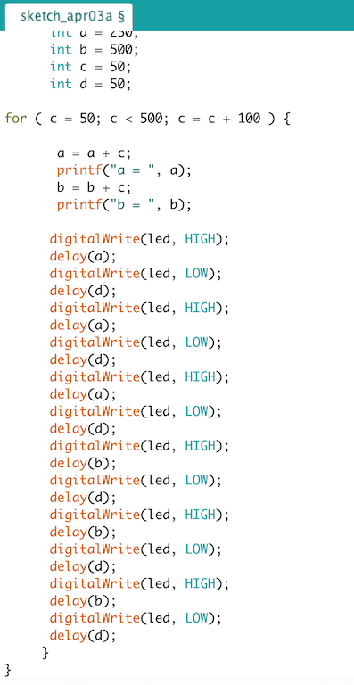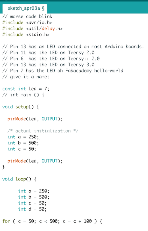 Blink Program, modified for hello-world board. Two screen shots of a long program. Splice them together at the "for" loop.