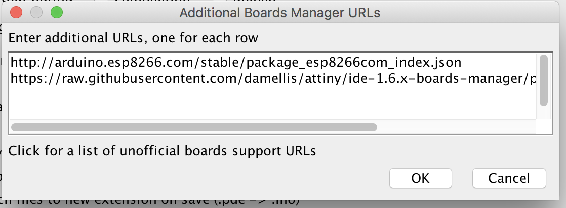 You can enter more than one programmer in here, if you seperate the URL's with commas. In the above case, I would follow the existing entry with a comma, and then type: https://raw.githubusercontent.com/damellis/attiny/ide-1.6.x-boards-manager/package_damellis_attiny_index.json