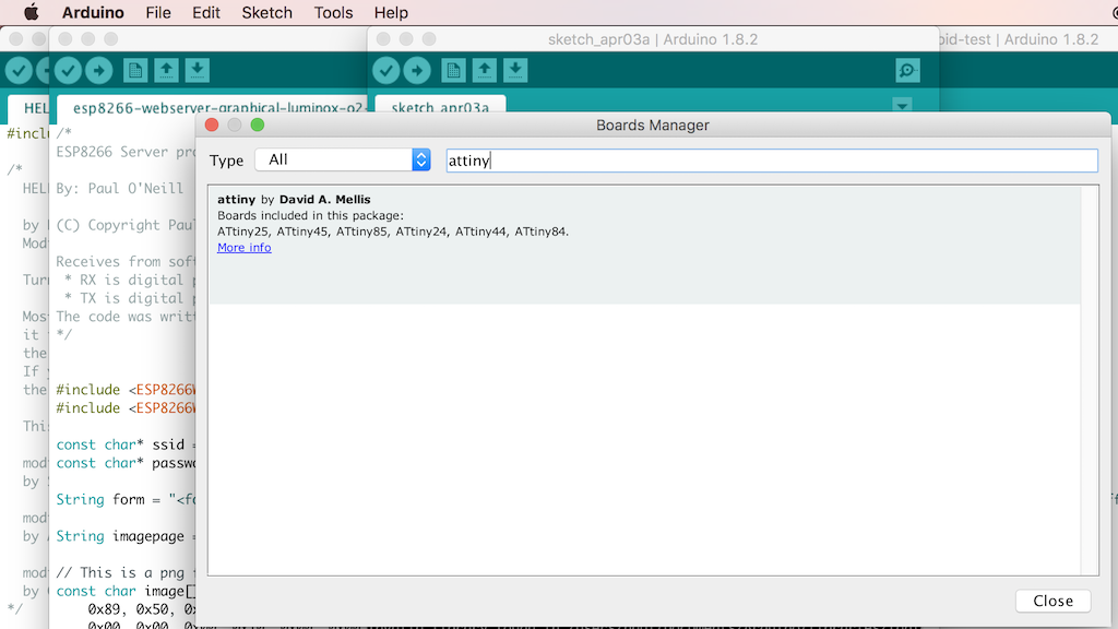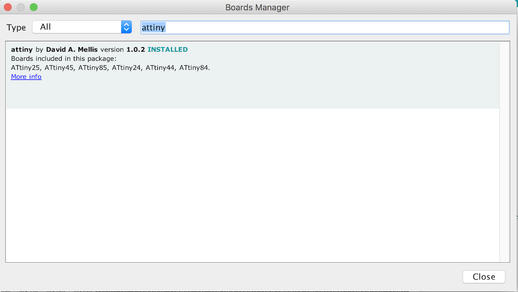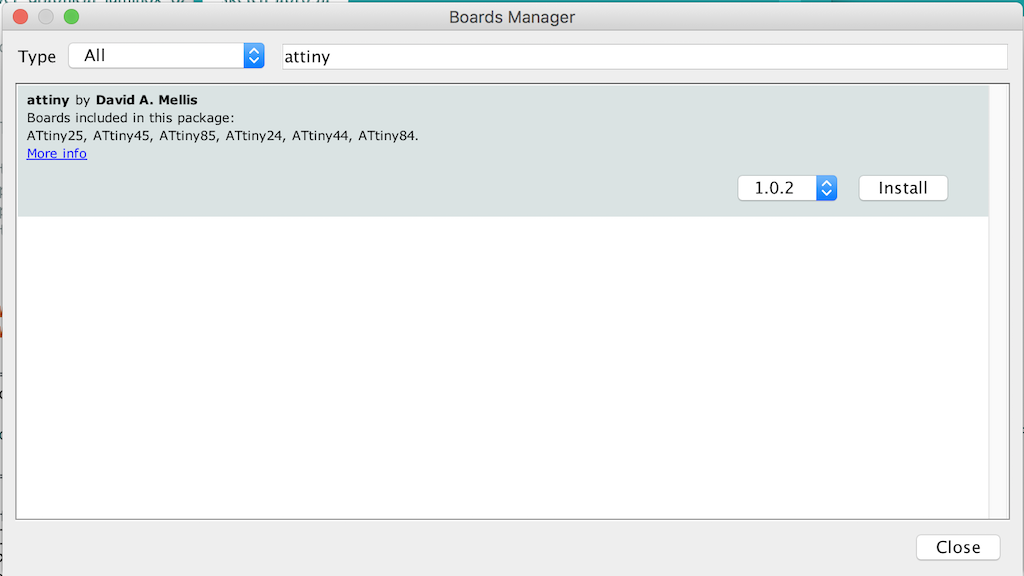 The next thing you have to do is select the ATTiny from the modified list of targets and install it.