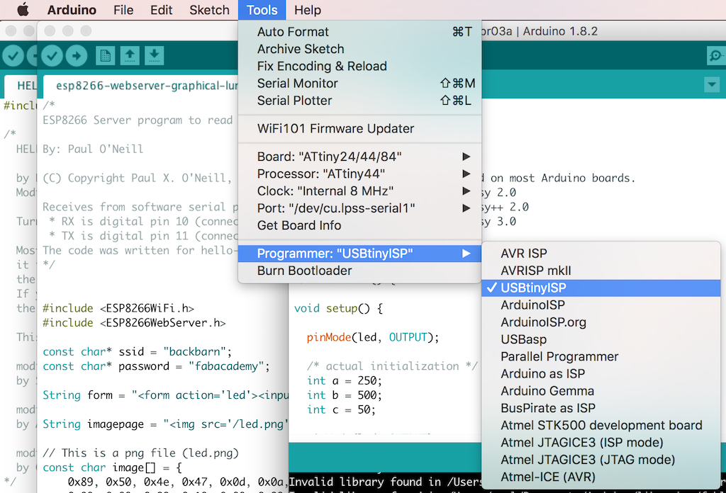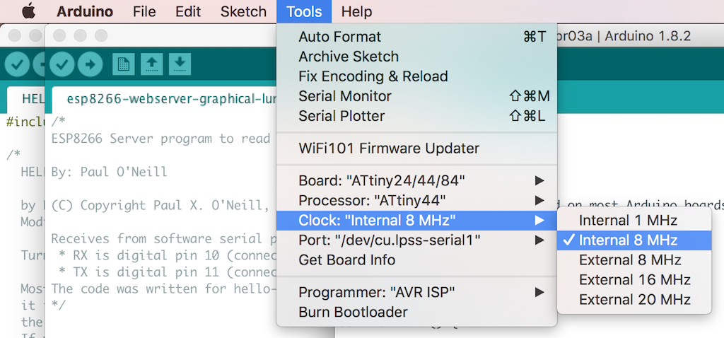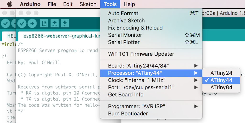 Next, we have to select the correct settings for the board. We will be selecting Board = ATTINY44, 8MHZ internal clock, and Programmer = USBtinyISP.