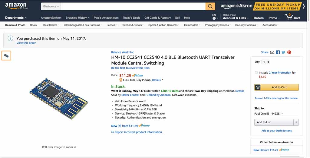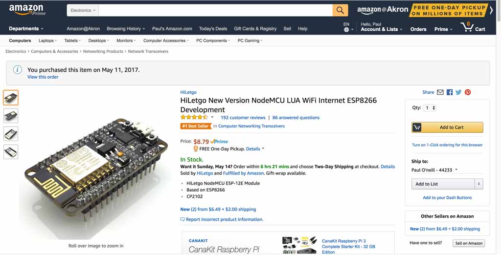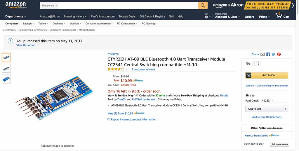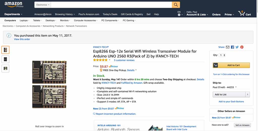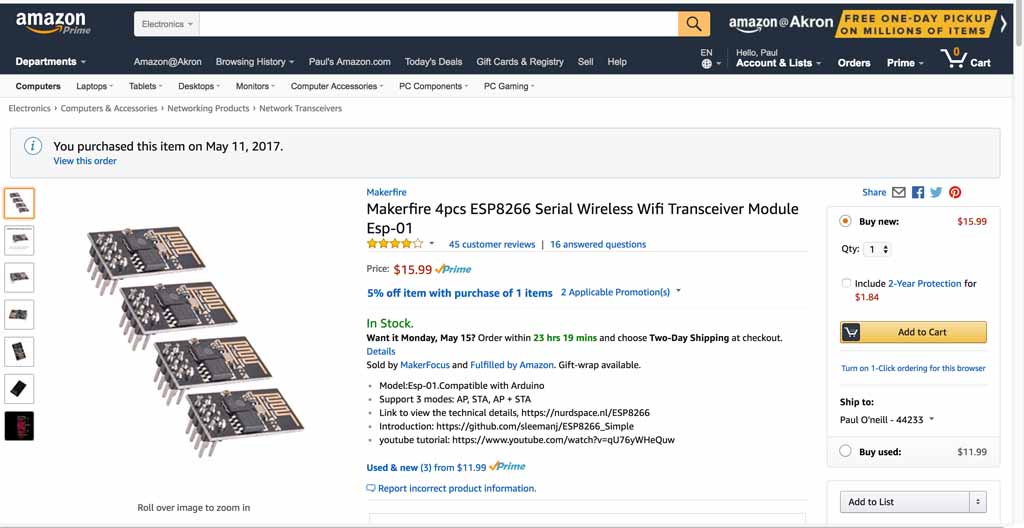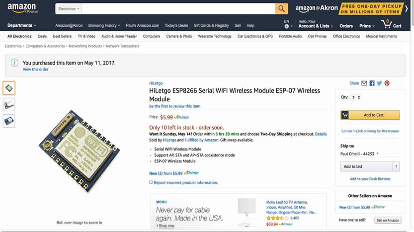 This week I will explore a couple of devices discussed by Neil. One is a WIFI (802.11) device and one is a Bluetooth device. I did not see any of these devices, or "modules" in the LCCC FabLab inventory, so I ordered some.