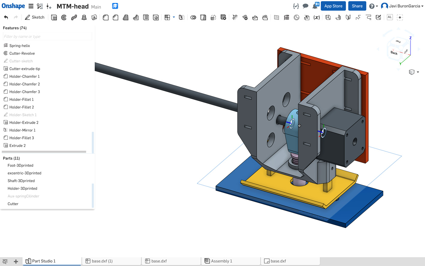 Once the basic dimensions and relationships between parts have been defined, a number of fillets and changers are introduced to remove material in areas that are needed, allow a better view of the paper roll and the puncture mechanism and facilitate tool access for assembly and fine adjustment.