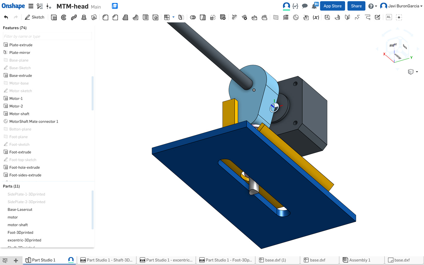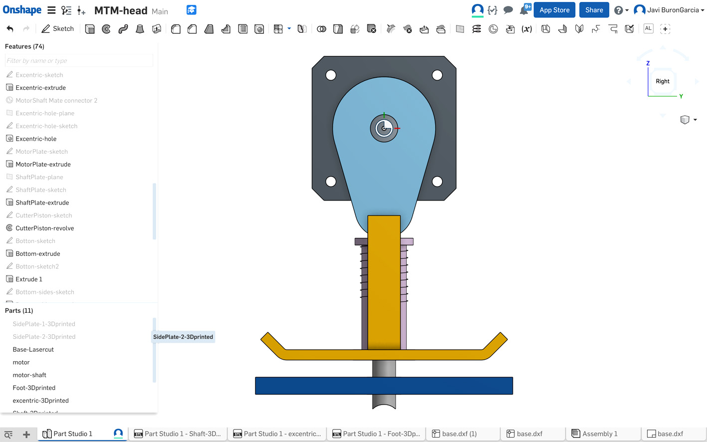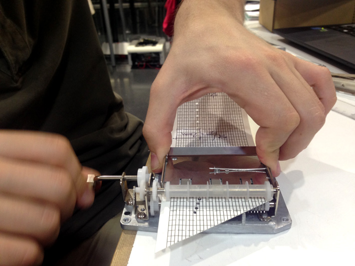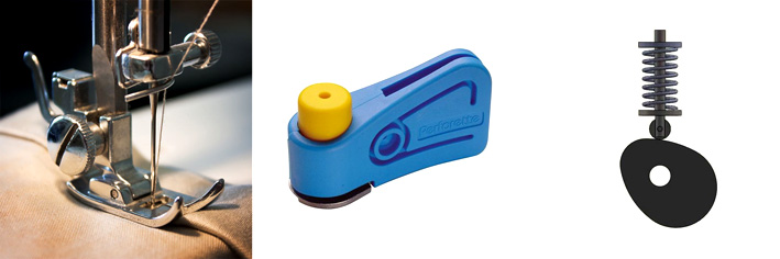 For the Head design we used three main references: the foot of a sewing machine, which allows the needle to puncture the textile while keeping the textile fixed on the vertical axis, handheld paper perforators, which uses a spring to move the shaft up and down, and the cam and follower mechanism, which uses an eccentric piece to transform a rotational movement into an sliding one.
