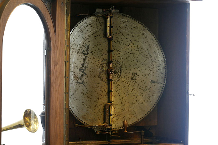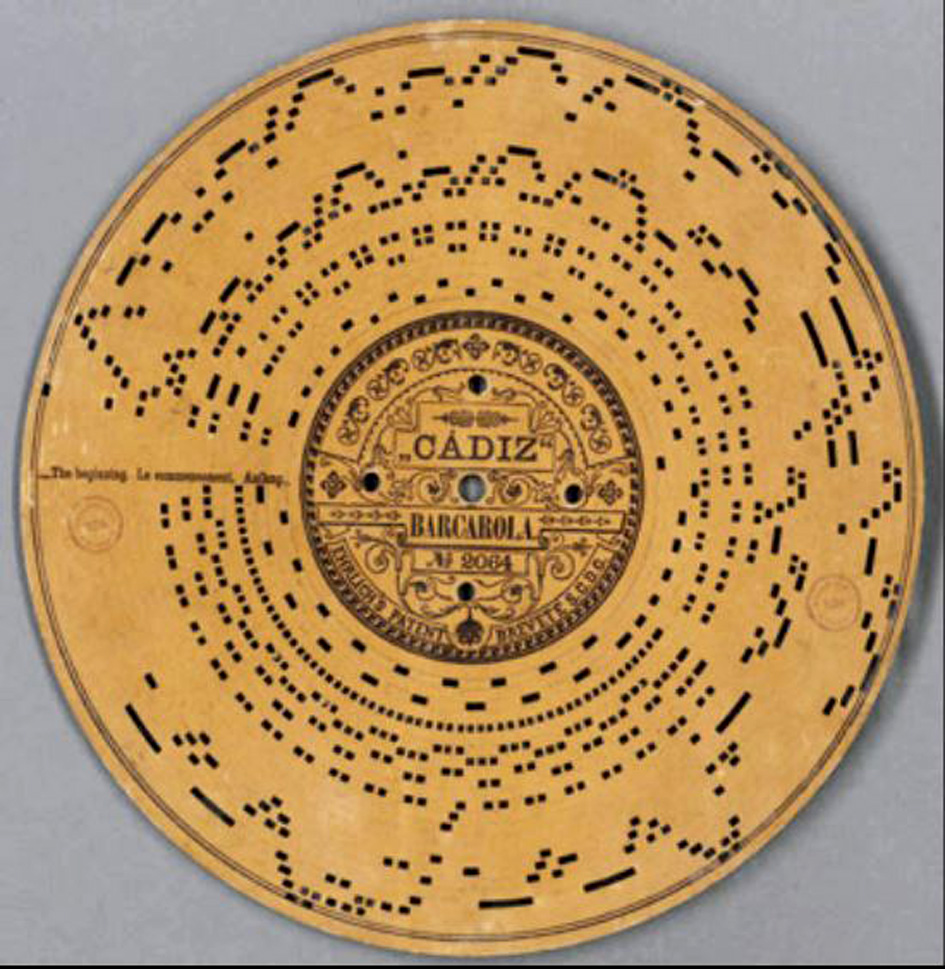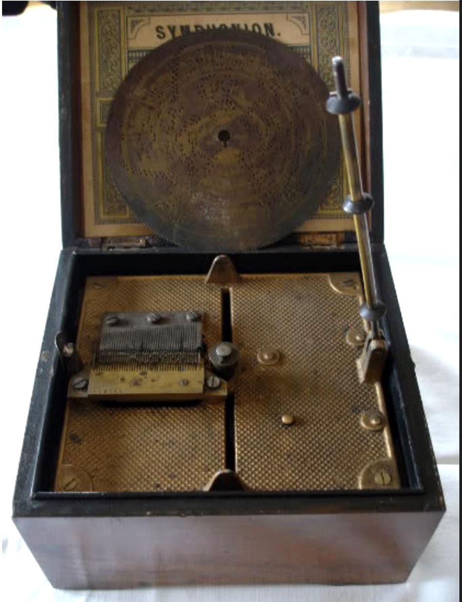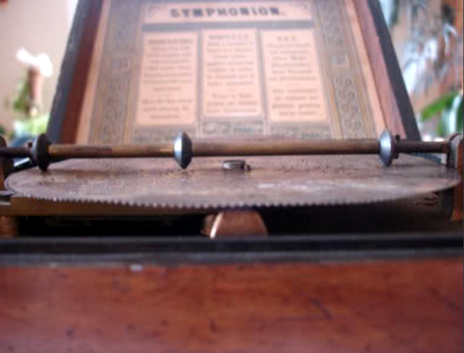 The tune is punched out on the disc with pitch determined by the position of the punching. In the manufacturing process, the punched metal was curled back onto the underside of the disc, creating a raised projection that resembles a letter P when viewed obliquely.