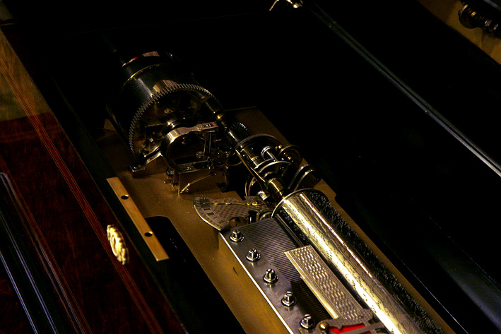 A music box or musical box is an automatic musical instrument that produces sounds by the use of a set of pins placed on a revolving cylinder or disc so as to pluck the tuned teeth (or lamellae) of a steel comb.