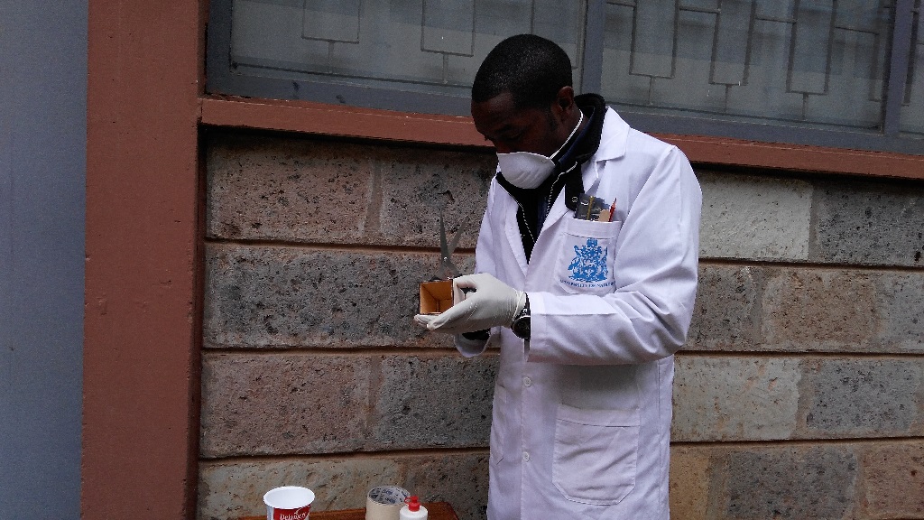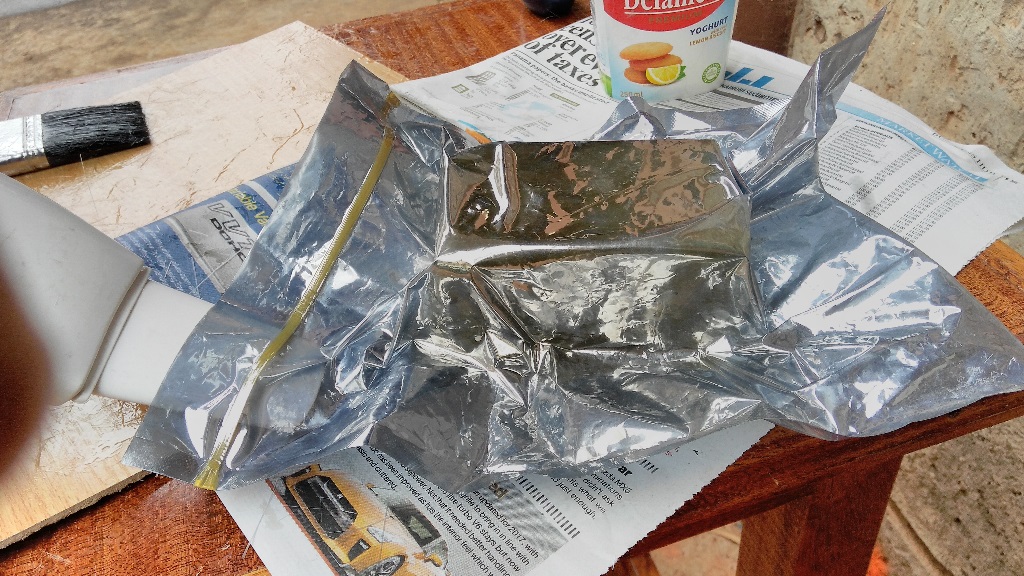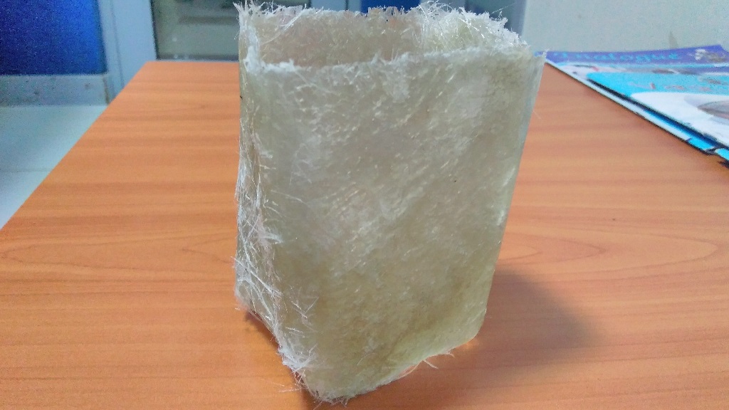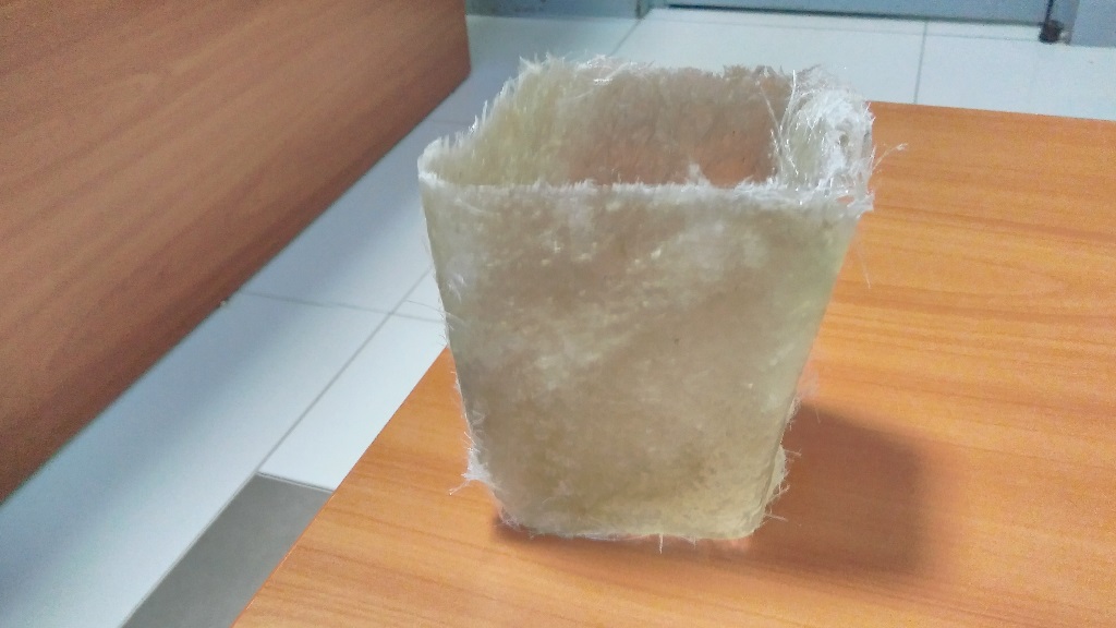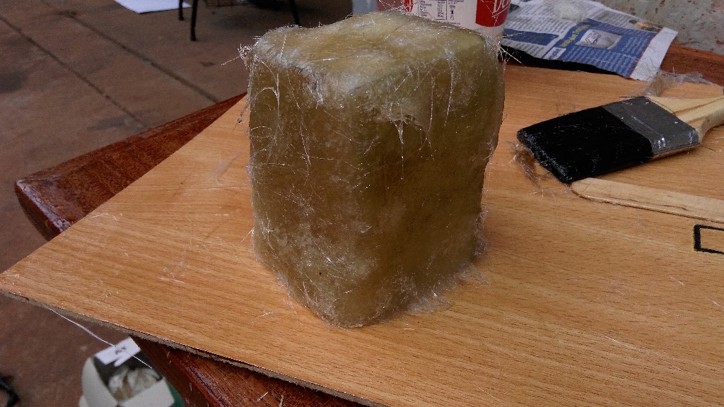 After mixing thoroughly for about a minute and 30 seconds, I applied some resin on to the surface of the mold and then started to arrange nicely cut pieces of the fibreglass on to the mold. After putting on the first layer I applied some resin on it using a painting brush. Then I placed another layer on it and applied some more resin. I did this for four layers of fibreglass and as you can guess, it was messy, very wet and the smell couldn't get any better, but it was also fun.