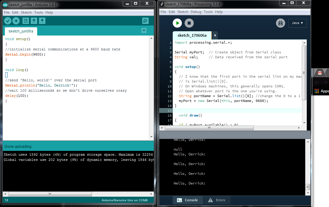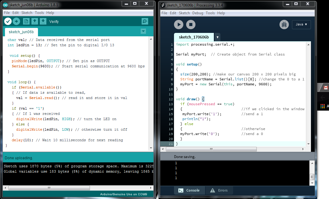 I used the arduino for serial communication with my processing interface. The first programs I wrote were to enable commands from Arduino to processing.