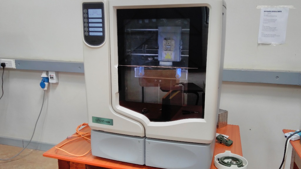 I was using the uPrint SE plus 3D printer to print the model. I placed it at a horizontal orientation to ensure that it uses less support material in holding the suspended parts.