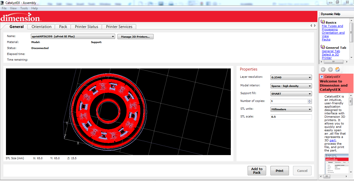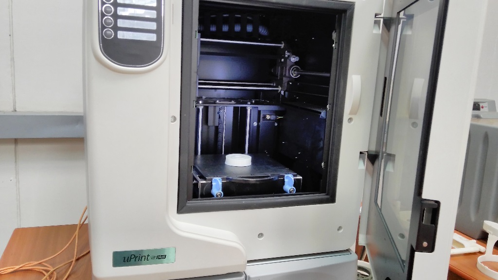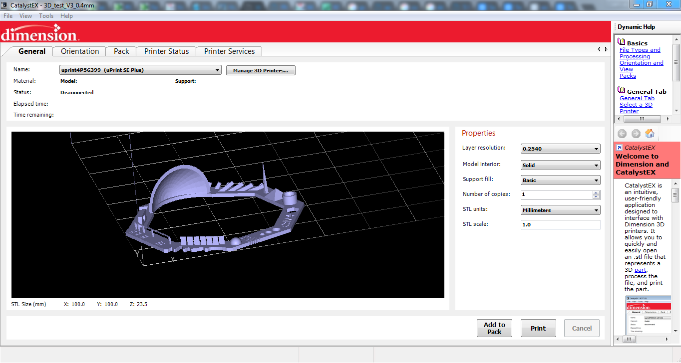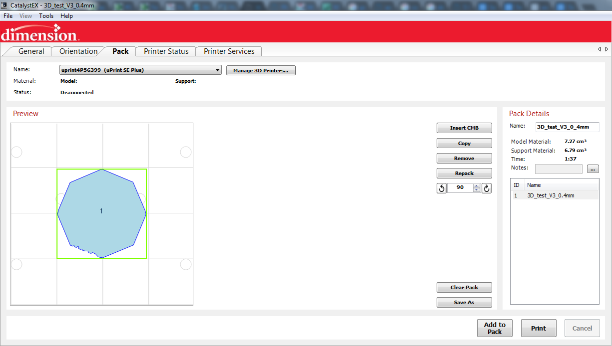 I powered the uPrint SE plus and on my computer I ran CatalystEX to send the file to the printer. I needed to ensure that I use no support material on this test. Turns out that on this machine you do not have an option to print without the support material as the software generates that on its own. the only thing you can do is specify how much support can be used i.e. BASIC, SMART or SURROUND. It also automatically generates Raft for every print that has to be done