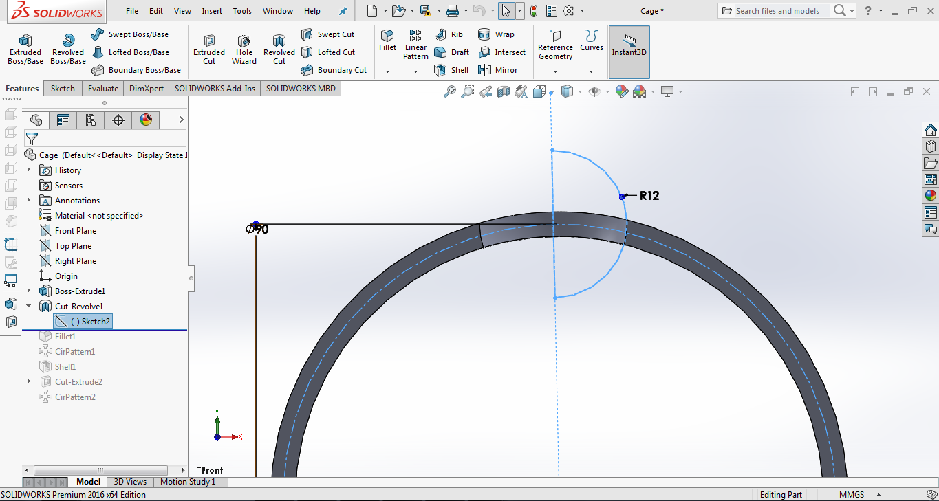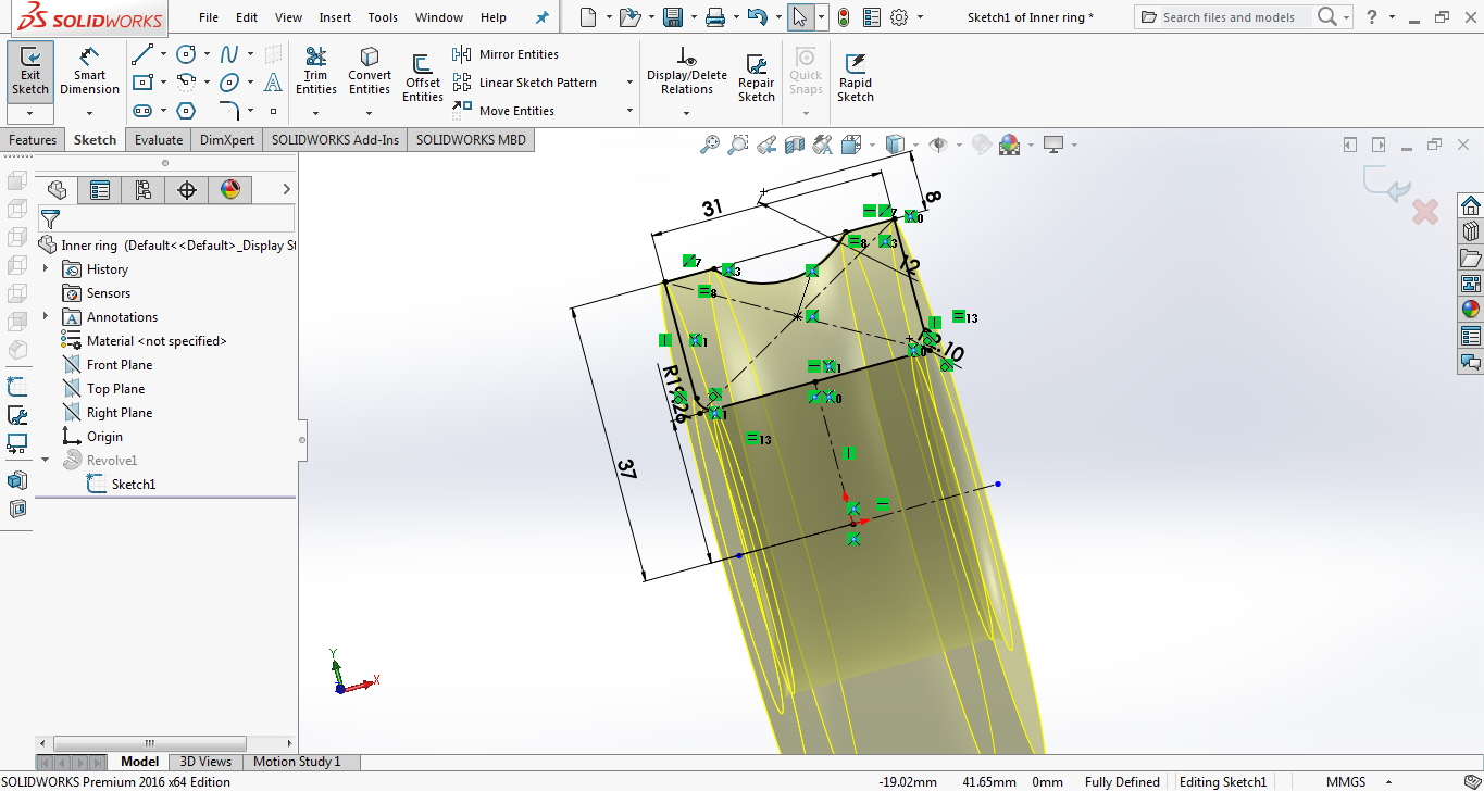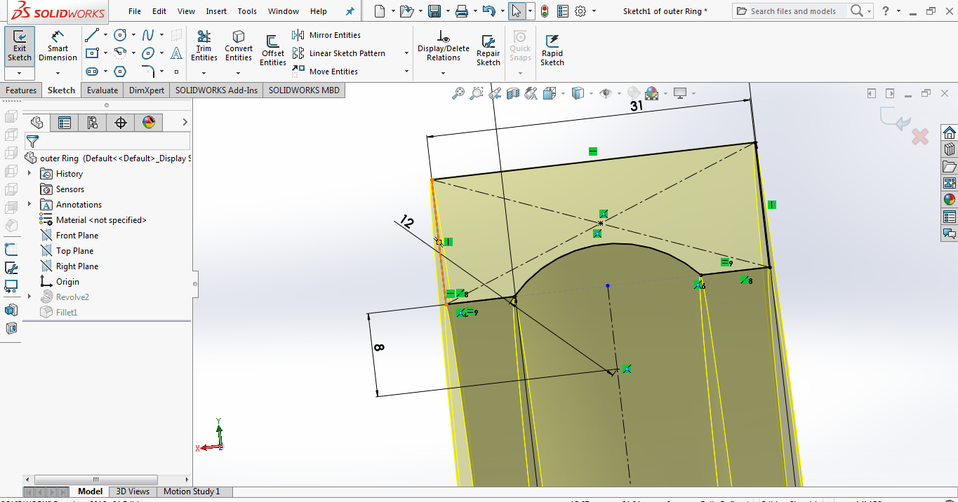 For the outer ring, I drew a cross-sectional thickness of 31mm and because I wanted it to have a groove inside, I included a curve of 12mm radius. Once the cross-section frame was done I conducted an extrusion by revolving it to 360°