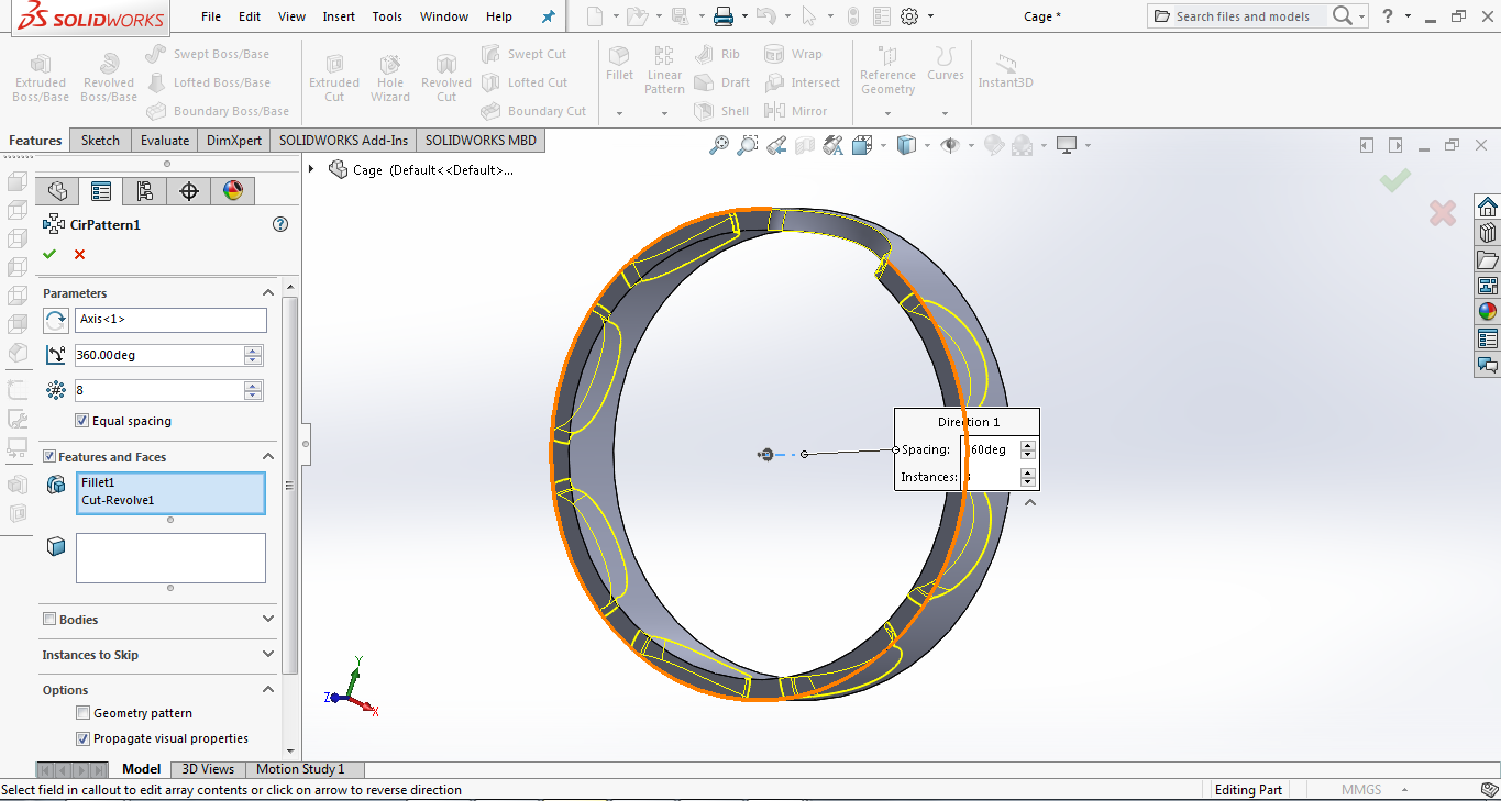 I then did an 8-part circular pattern cut revolve at 360° to get more cuts around the ring.