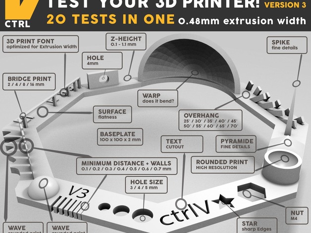 To conduct tests on the design rules of our printer I downloaded this detailed file on Thingyverse Test your 3D printer! v3