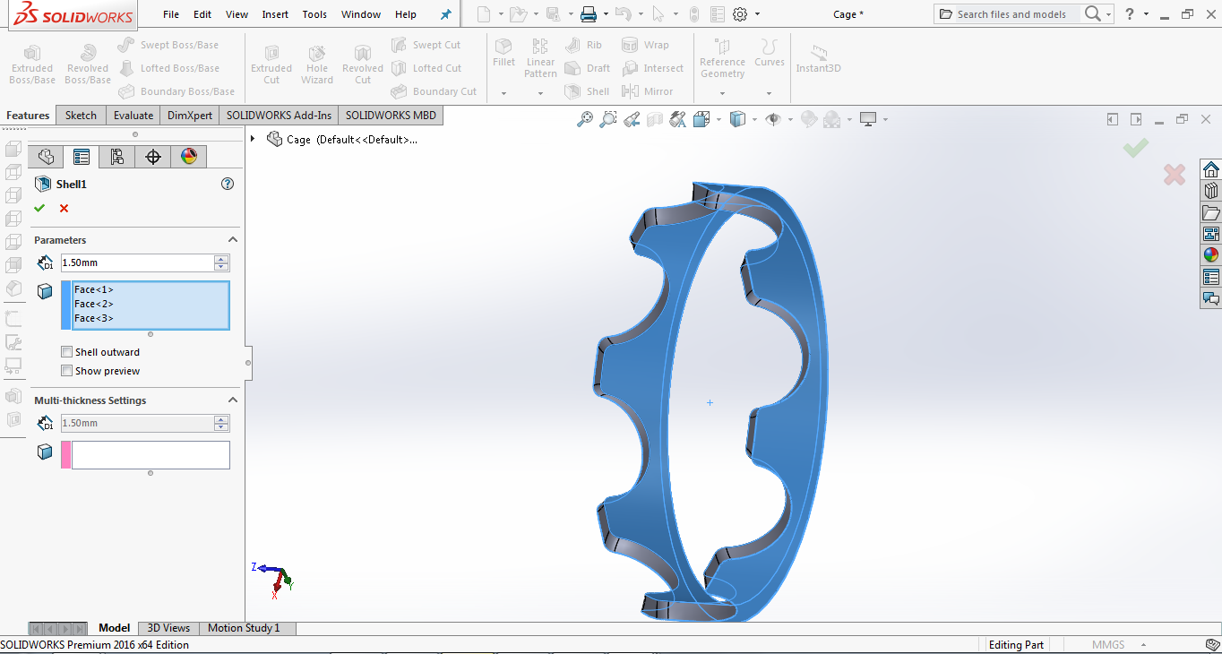 After that I did a shell of the part to reduce it to size. I selected al the faces that I needed shelled off and voila!....I had the cage I needed :)