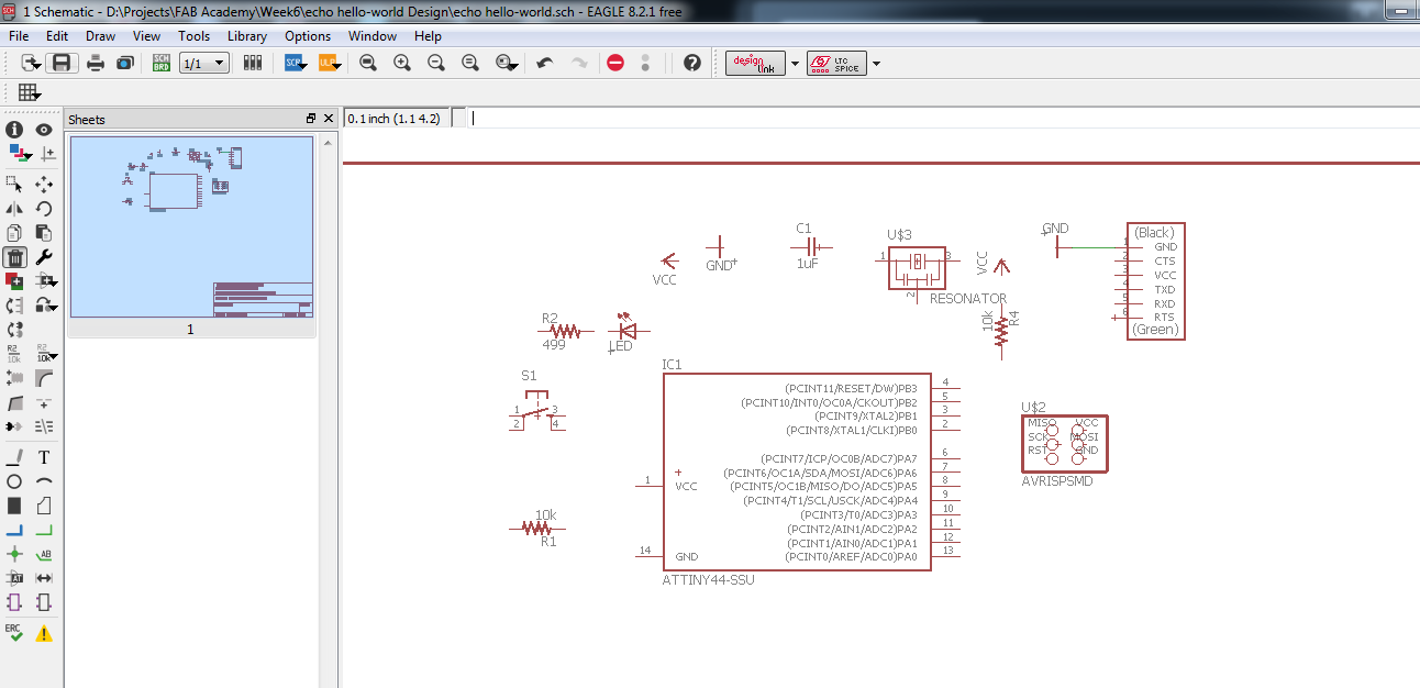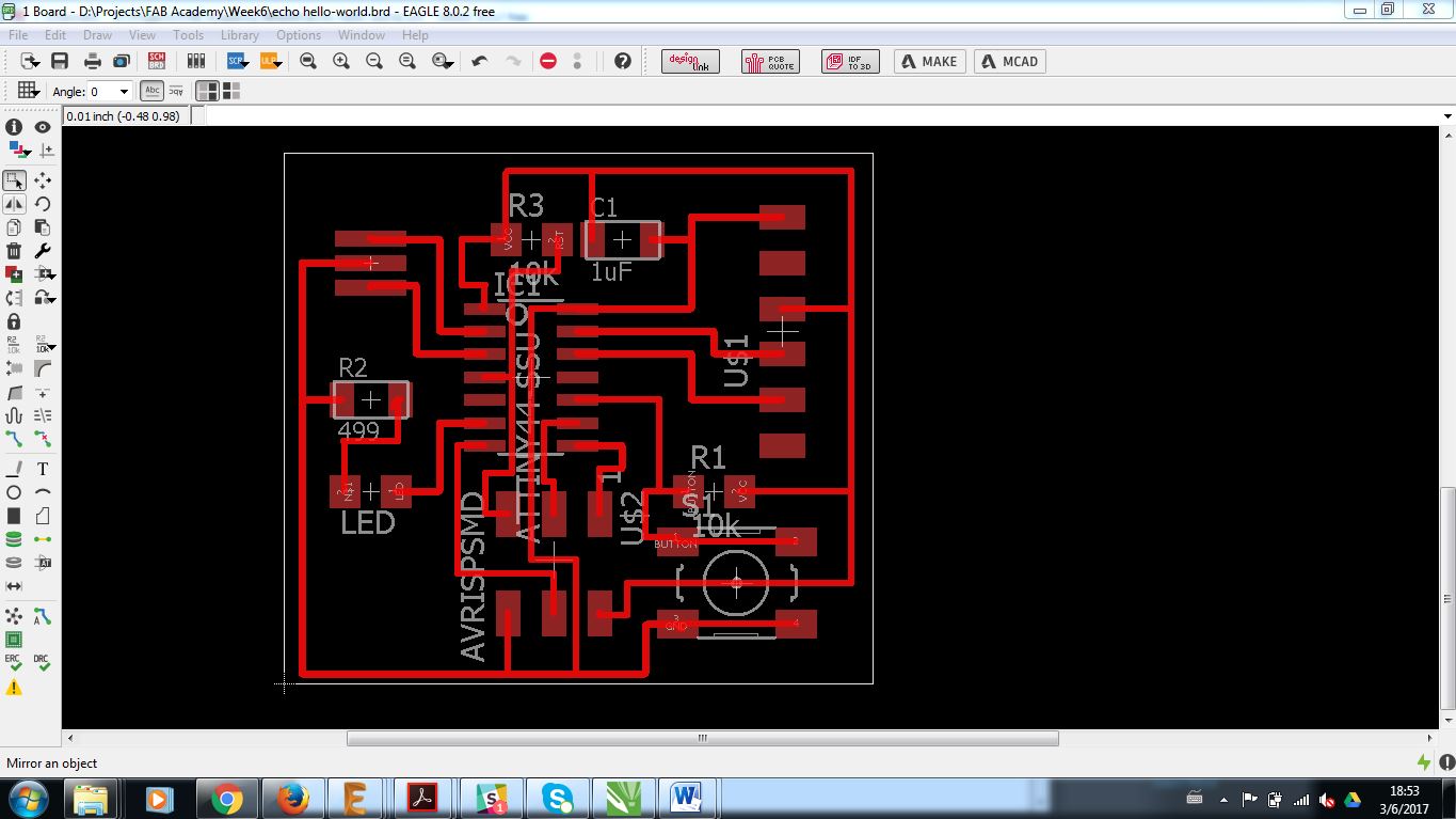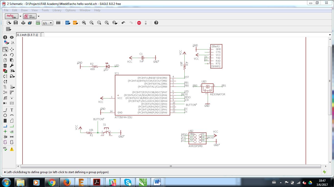 I used Eagle to design this week's circuit.Thanks to Anna I was able to navigate through some of the challenging parts.In order to get some of the specific components that I needed for this assignment, I downloaded the fab lbr, FAB_Hello and Neil's ng libraries. I then added them to eagle by going to Control panel > Options > Directory > Libraries. Here you specify the folder in which the new library is located. Once you hit ok you are set to go!
