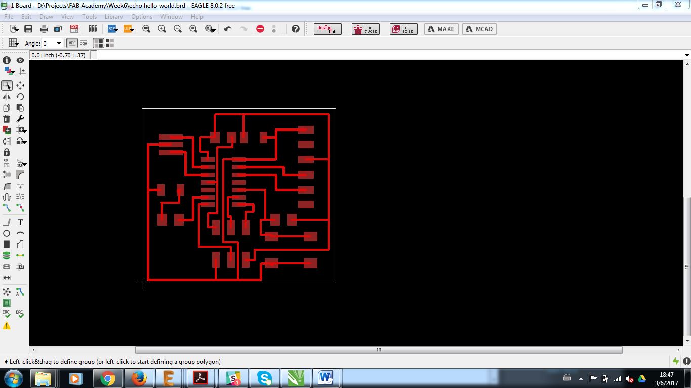 Here, all the components ad their connections were located outside the default workspace. I moved them insideone by one strategically locating them in a manner that will make it easier to route. I then routed them manually. The trace width is an important aspect of the board so I increased the width from default to 0.012. This would reduce the chances of having broken traces on the board during fabrication.I then routed the board on the TOP copper. While routing I also ensured that I had left enough spaces between the traces to avoid short circuiting