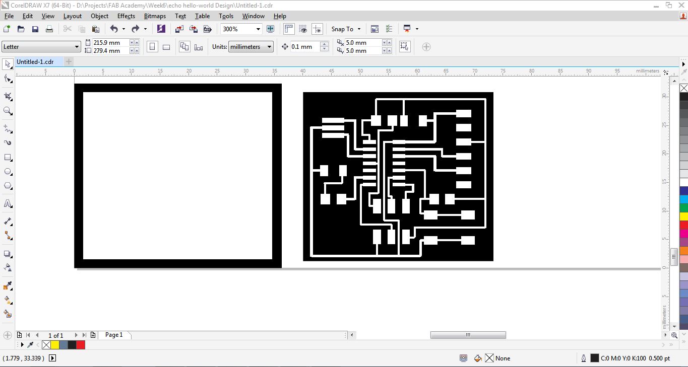I exported the circuit in monochrome PNG format but the image turned out to be slightly larger than the size I needed for milling which should have been just withing the circuit margin I had defined. So I imported the png file to Corel Draw and trimmed it to size.